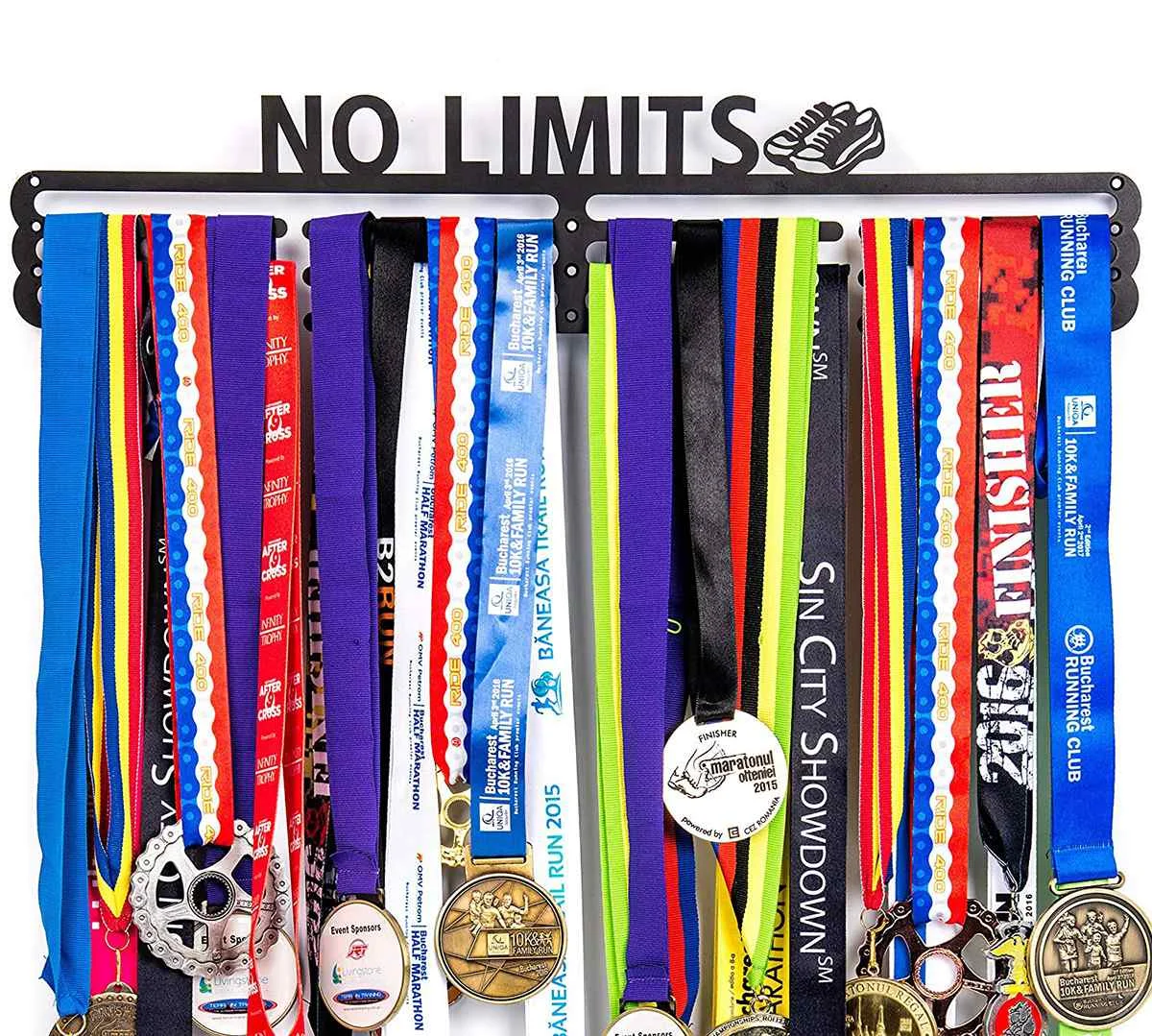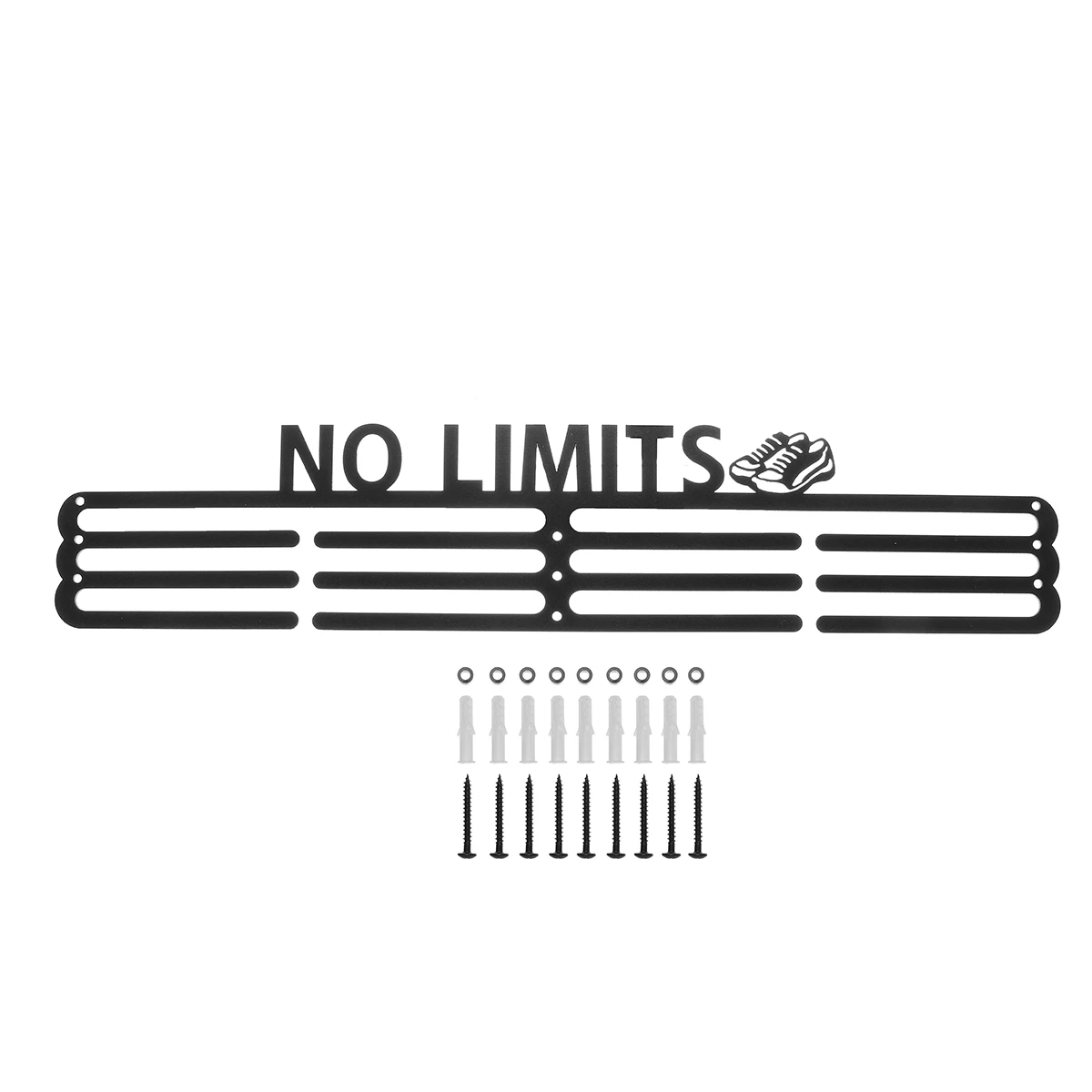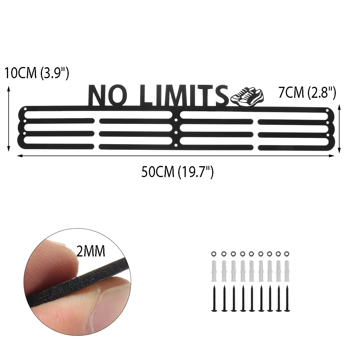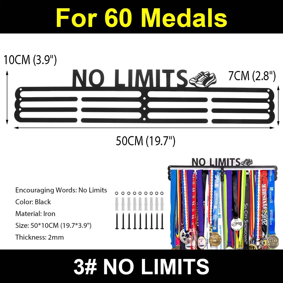 Технические характеристики:Наименование товара: вешалка для медалейОбодряющие слова: без ограниченийЦвет: черныйМатериал: железоРазмер: 50*10 см (19,7*3,9 ")Толщина: 2 ммОсобенности и преимущества:★Держатели медалей для бегунов: сделанные из железа дисплей медали не будет сгибаться с течением времени. Это идеальное напоминание о напряженной работе, которую вы вложили, и идеально подходит для гимнастики, баскетбола, бега, волейбола, плавания, тенниса или триатлона.★Отличная идея подарка для бегунов. Получить лучшее соотношение цены и качества: этот держатель медалей может вмещать до 60 + медали, и это просто вам одежду подходящего размера 19,7x3,9 дюйм (ов). В отличие от других продуктов, которые являются маленькими и не могут удерживать эти много медалей, это правильный выбор для вас! Идеально подходит для бега, футбола, гимнастики, танцев, плавания, бейсбола и хоккейных медалей.★Легко установить дисплей медали: мы включили 9 винтов для крепления этой медали вешалки в Вашу стену. Благодаря своей безопасной системе с 9 точками он будет удерживать большой вес, не сгибая и не риская упасть со стены.Комплектация:1x медаль ВешалкаОбратите внимание:1. Допускается погрешность в 1-3 мм из-за ручного измерения. Пожалуйста, убедитесь, что вы не возражаете, прежде чем сделать ставку.2. Цвет может отличаться от цвета на дисплее, пожалуйста, поймите.3. Медали не включены!