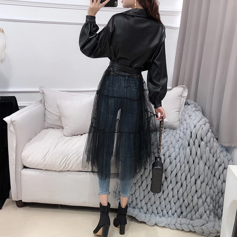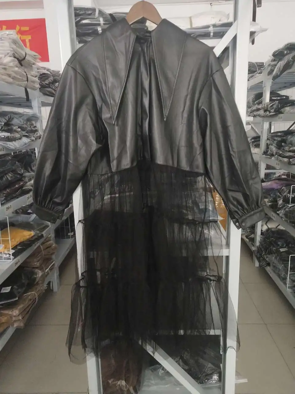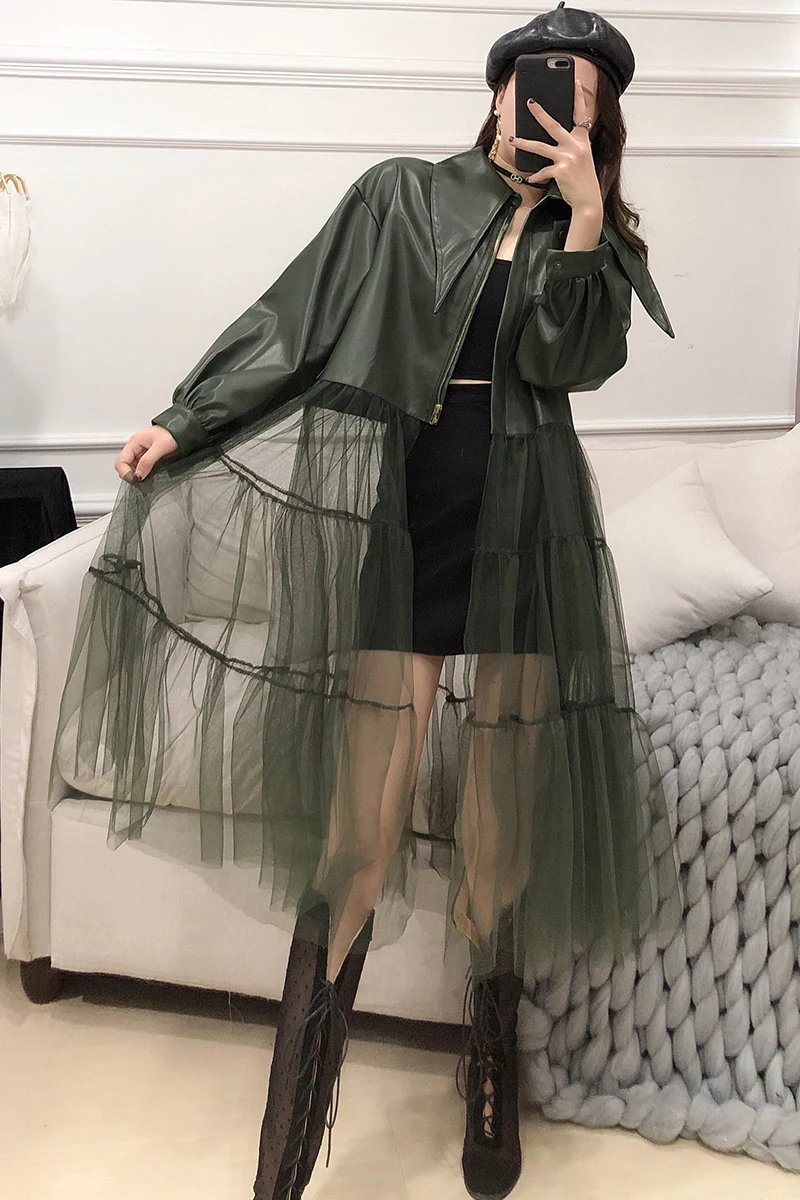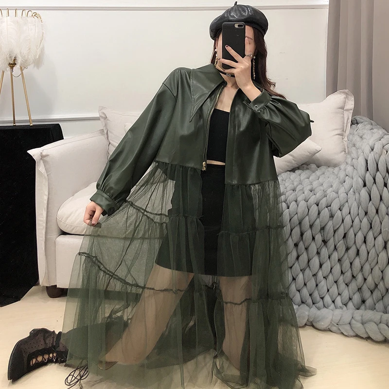 LANMREM 2021 новые весенние куртки, женские модные однотонные Туфли-Цвет длинной юбкой из сетчатого материала с газовыми вставками из искусственной кожи пальто с поясом женские PB279