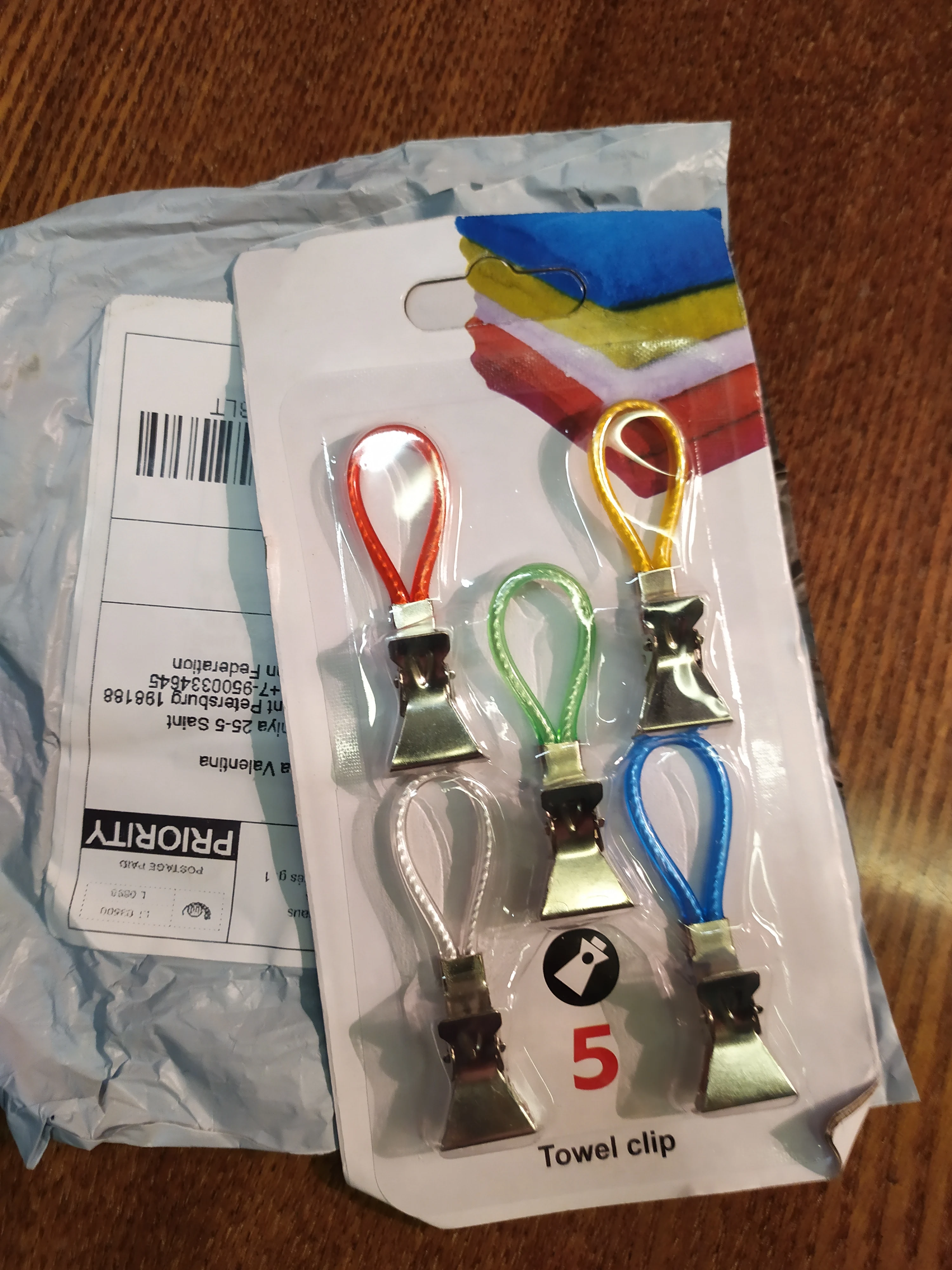 Заказ пришел через 10 дней. Упакован в двойной пакет и даже индивидуальная упаковка каждого комплекта была не помята. Товар соответствующего качества. Цветовая гамма, как на картинке. Функции свои выполняет - полотенце держится крепко. Вцелом, покупкой довольна. Продавца - рекомендую.