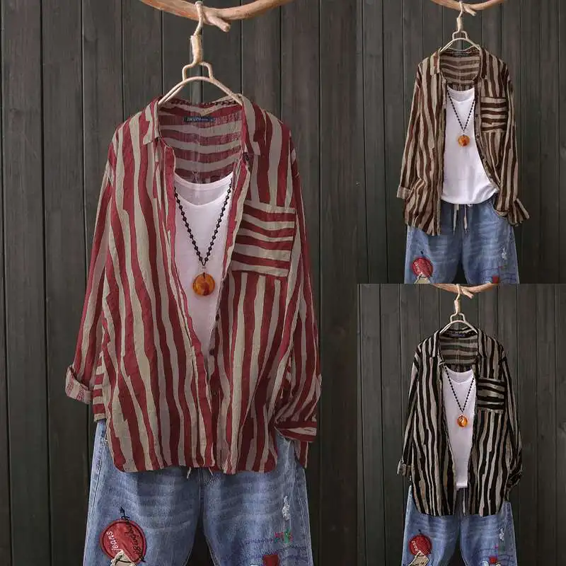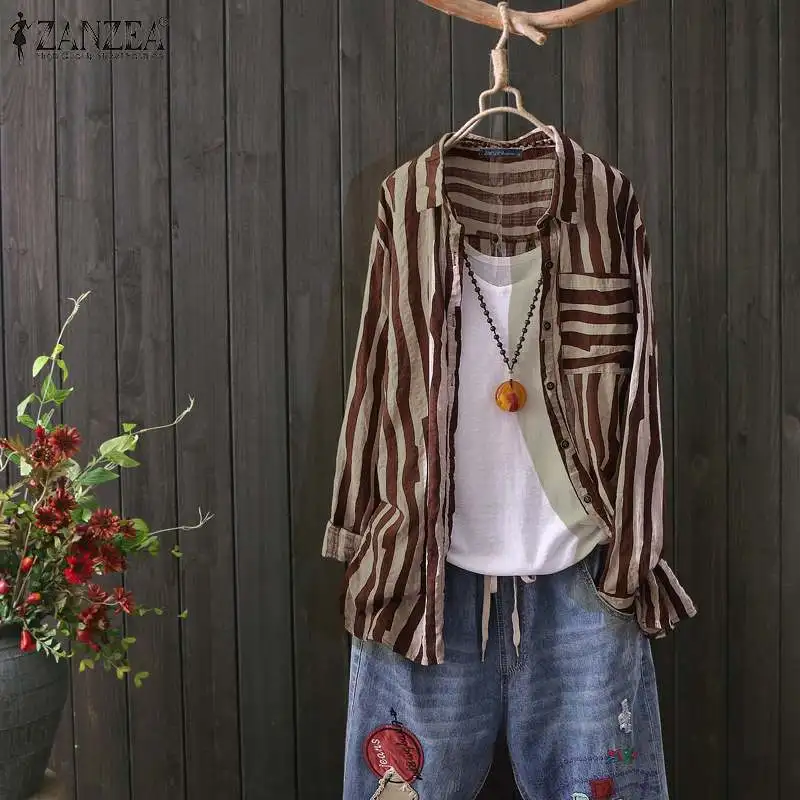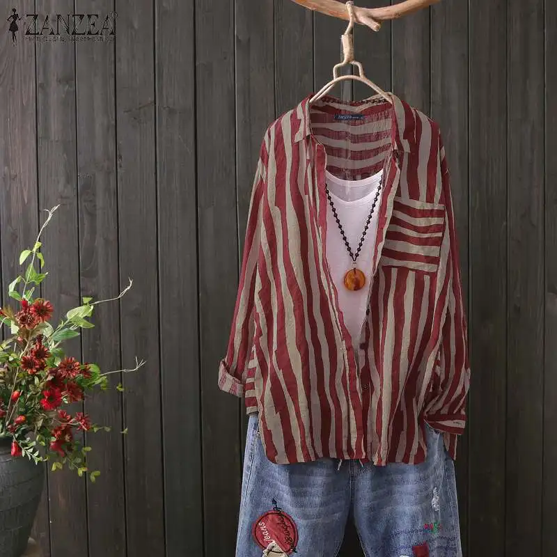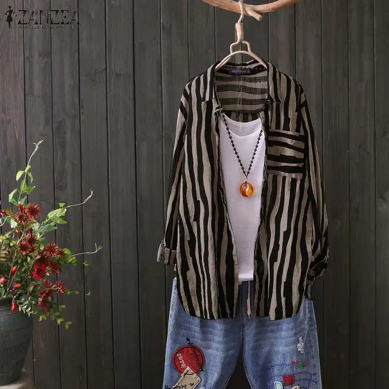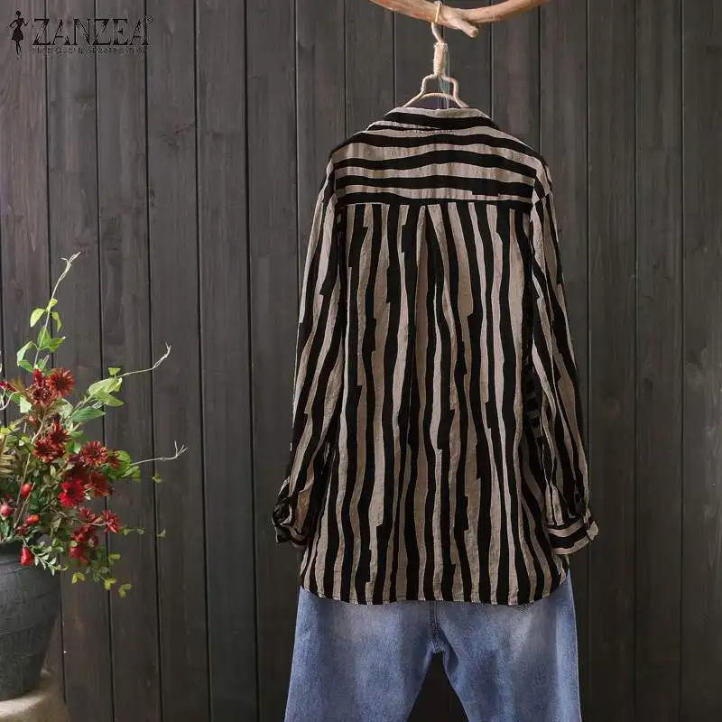 Рубашка ZANZEA Женская в полоску, винтажная Повседневная Блузка на пуговицах с длинным рукавом, с воротником с лацканами, Свободный кардиган, на осень