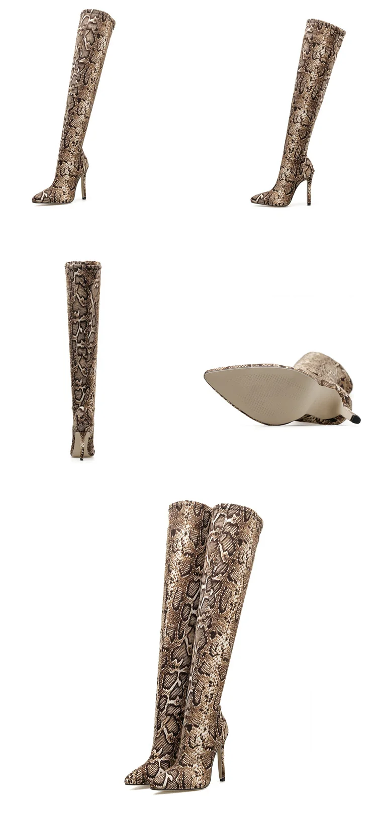 Eilykenвысокие сапоги до бедра пикантные Женские Сапоги выше колена высокие сапоги со змеиным узором на тонком высоком каблуке с острым носком Bottine Femme