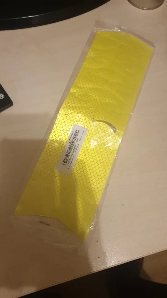 Товар пришел вместе со светоотражающей наклейкой. Двухсторонний скотч в комплекте.