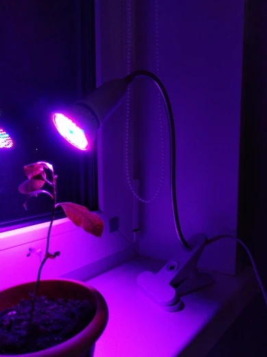 это моя первая лампа. надеюсь она поможет моим лимонам. цвет не раздражает. приятный такой. шнур длинный. металлическая основа прочная. прищепка тугая. слетать не будет. пока стоит так, но позже на полку уберу