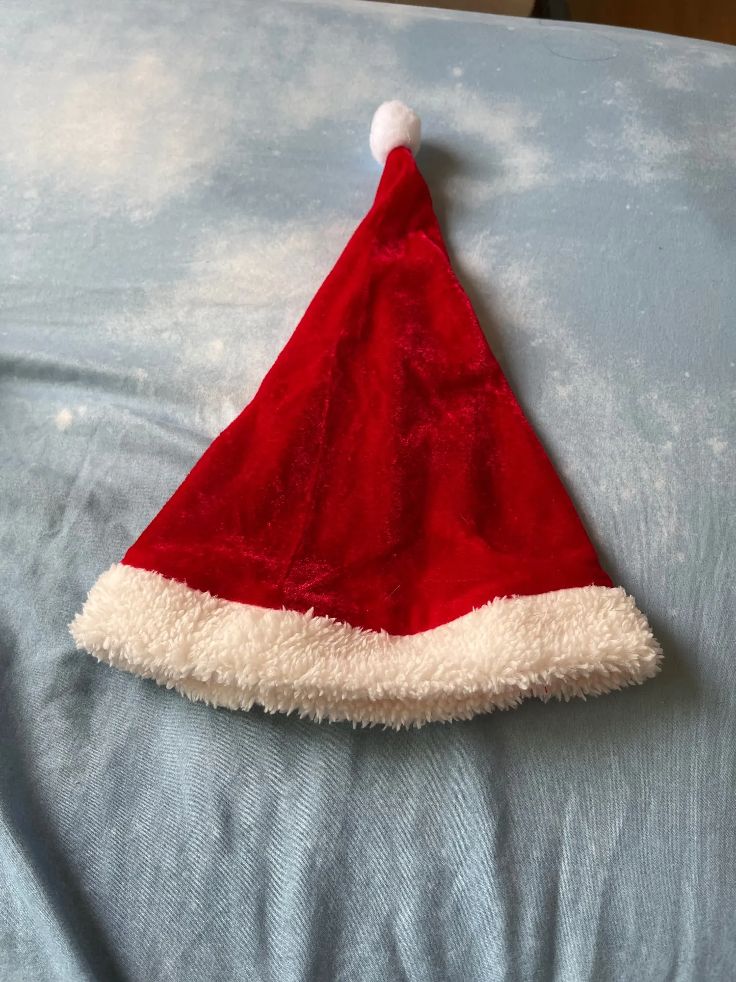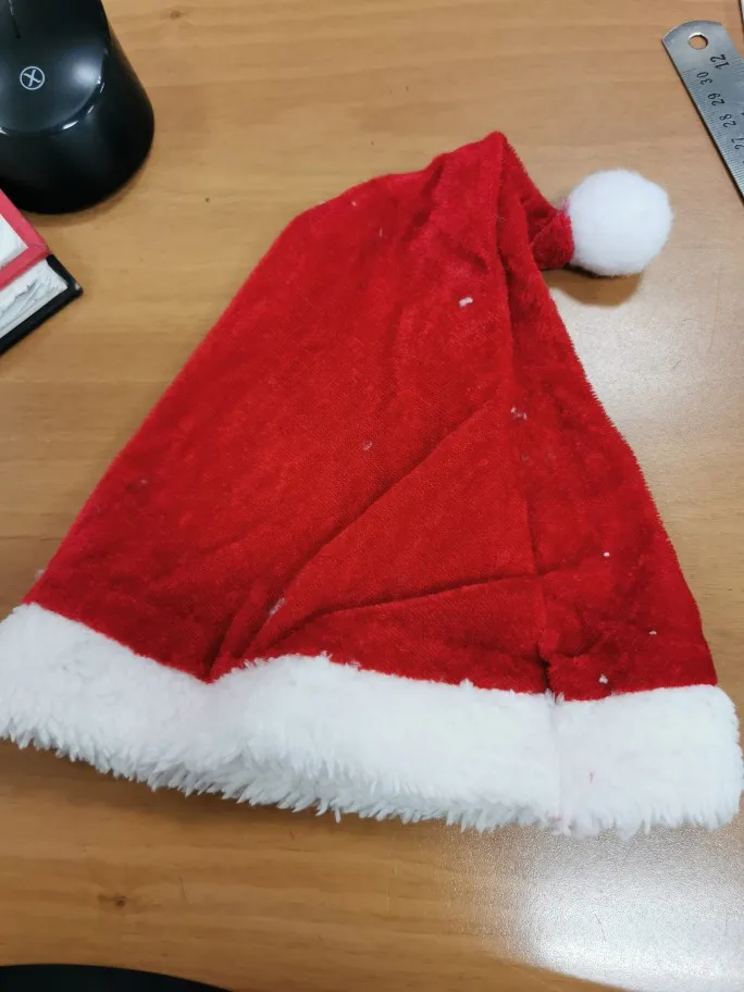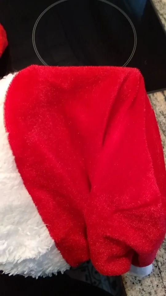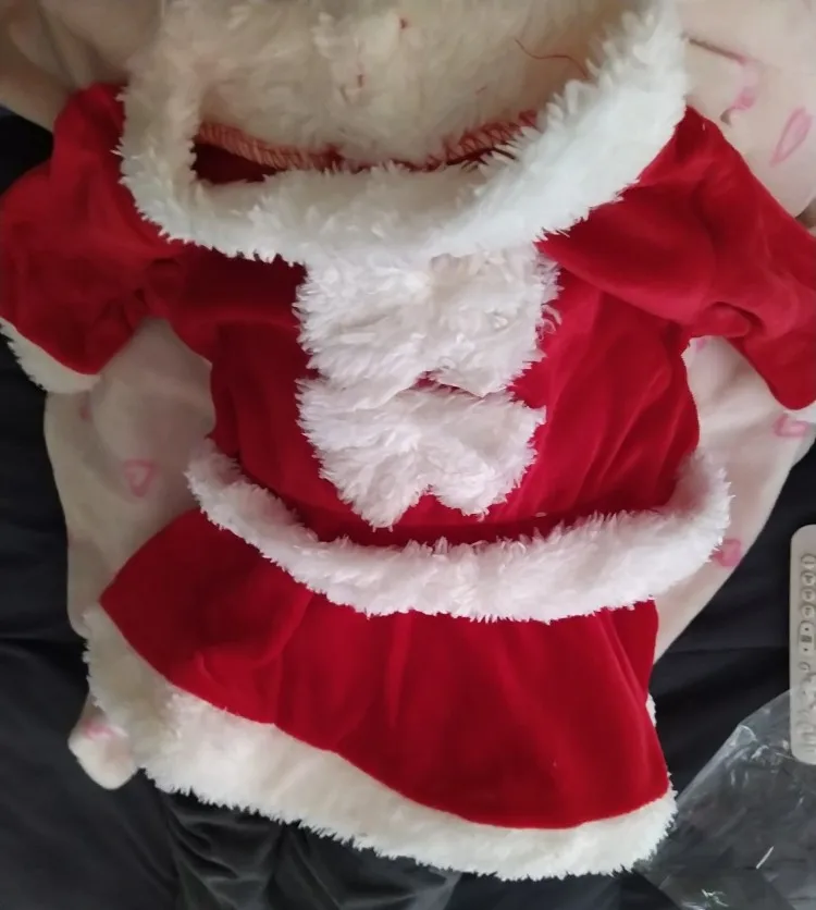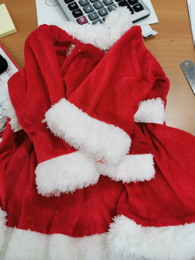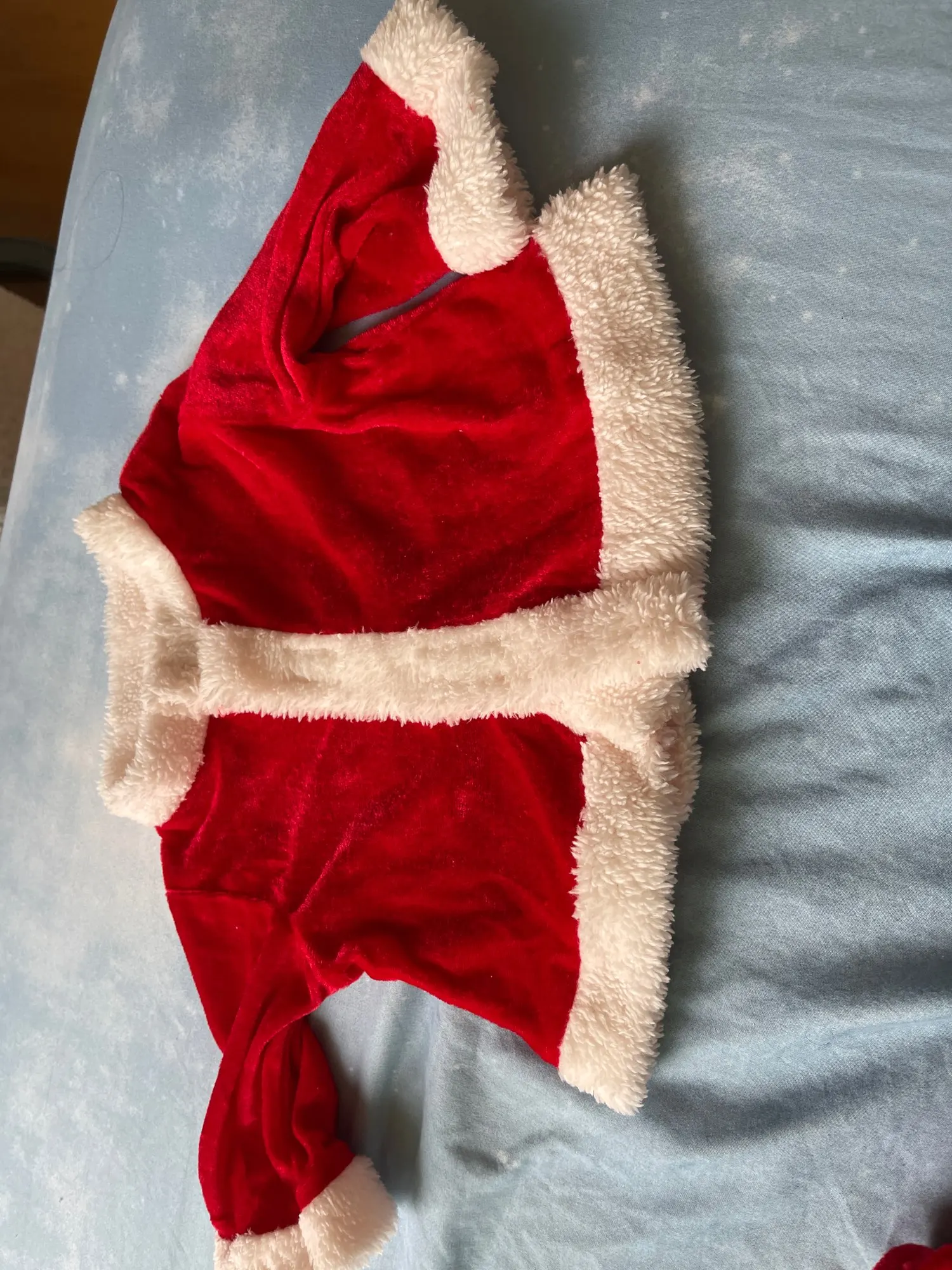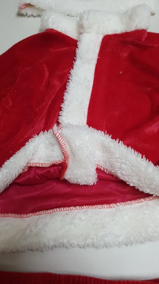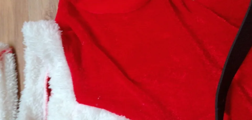 Костюм очень тонкий, ткань просвечивает. Белая опушка лезет, весь костюм в белых катышках. Шапочка ребёнку не наезда (ребёнку 1 год), хотя сам костюм по размеру.