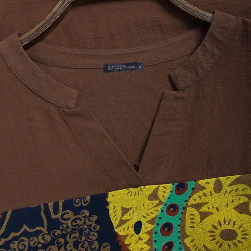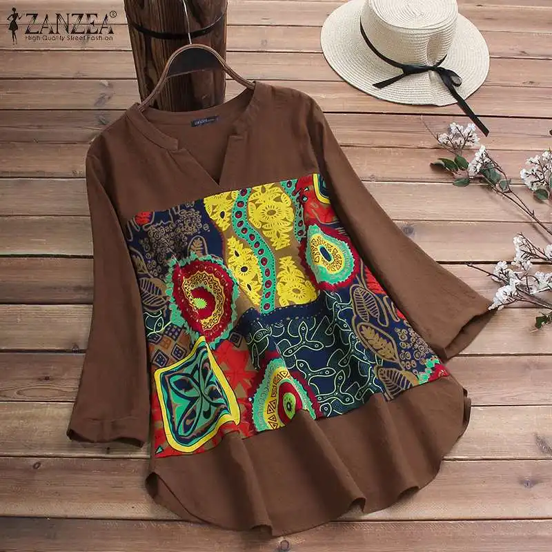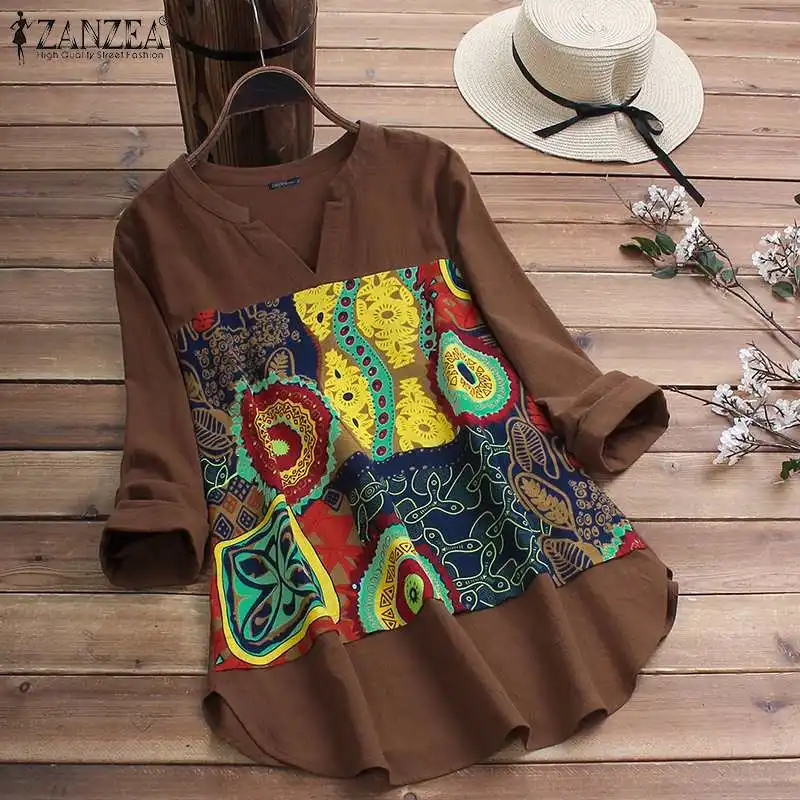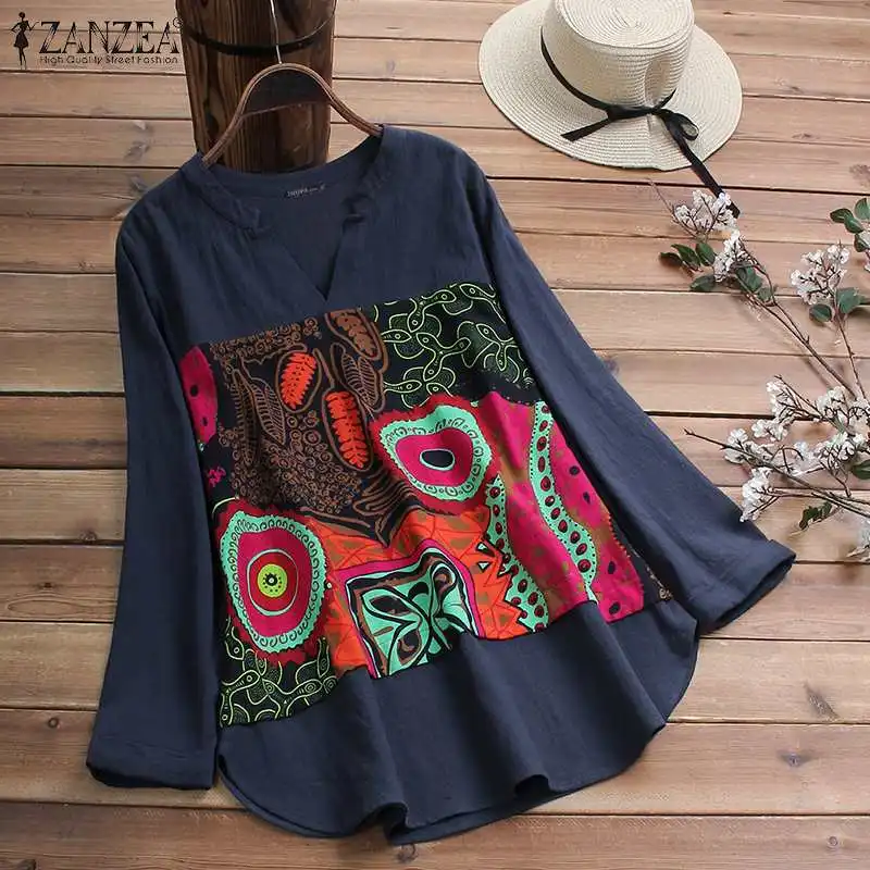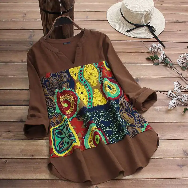 Женская хлопковая блузка с V-образным вырезом, длинным рукавом и винтажным принтом, осень 2021