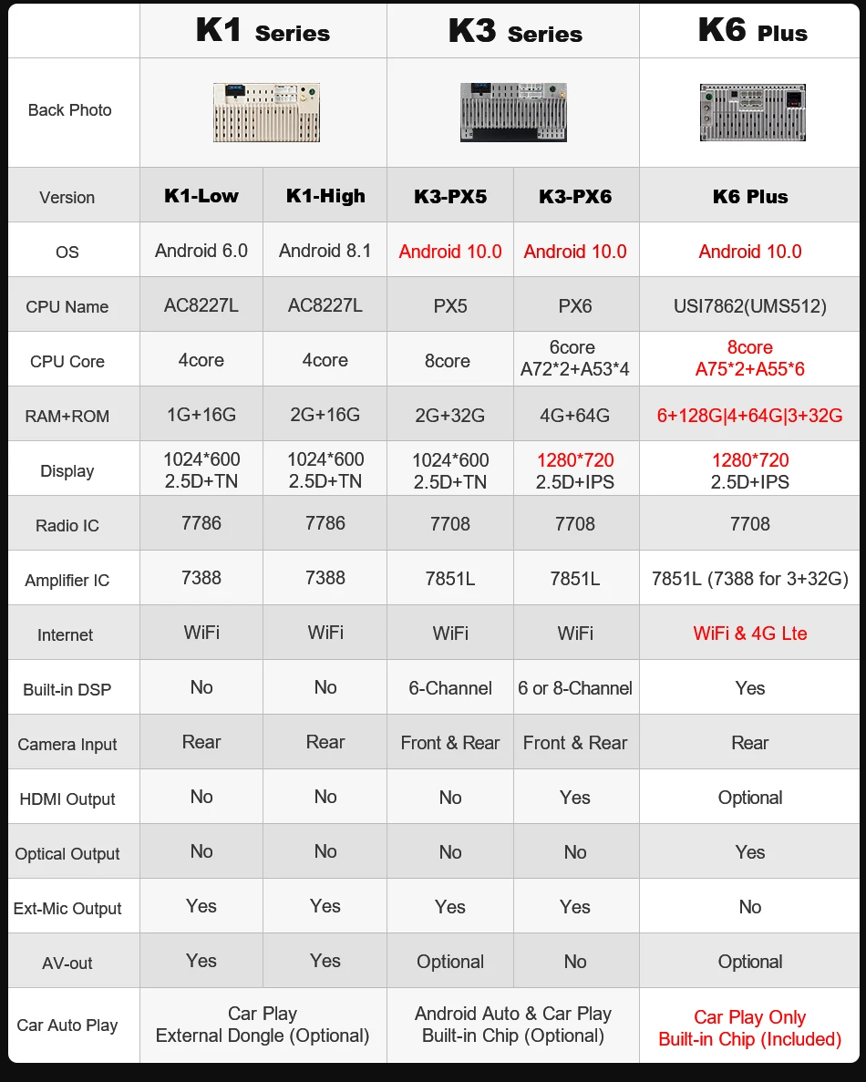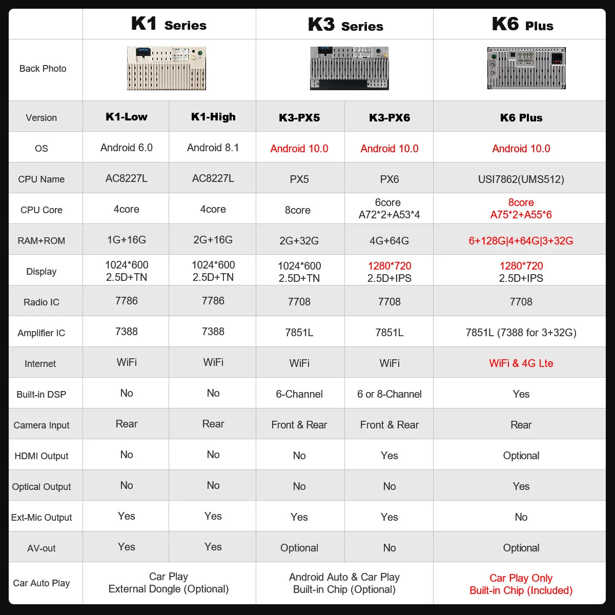 K3-PX6 ------- PX6 | Android 10,0 | 6 ядер (A75 * 2 + A53 * 4) | 4G + 64G | 2.5D +IPS1280*720| Радио 7708 | Усилитель 7851L