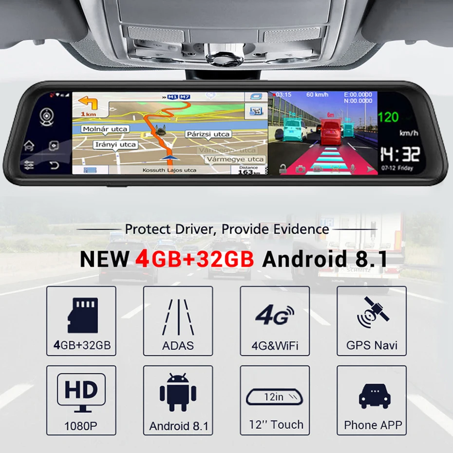 Видеорегистратор, 12 дюймов, 4G, Android 8,1, WIFI, GPS, ADAS, Авто...