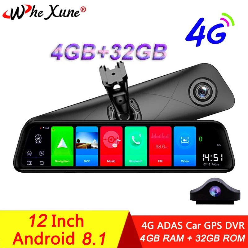 Автомобильный видеорегистратор WHEXUNE, 4 Гб + 32 ГБ, 12 дюймов, 4G, Android 8,1, GPS, Wi-Fi, Full HD, зеркало заднего вида