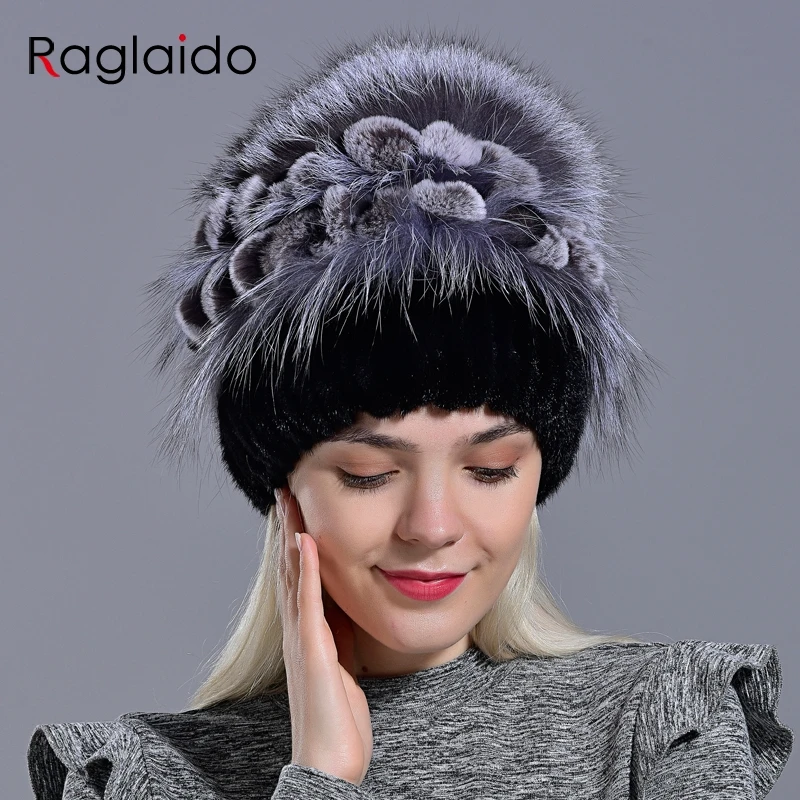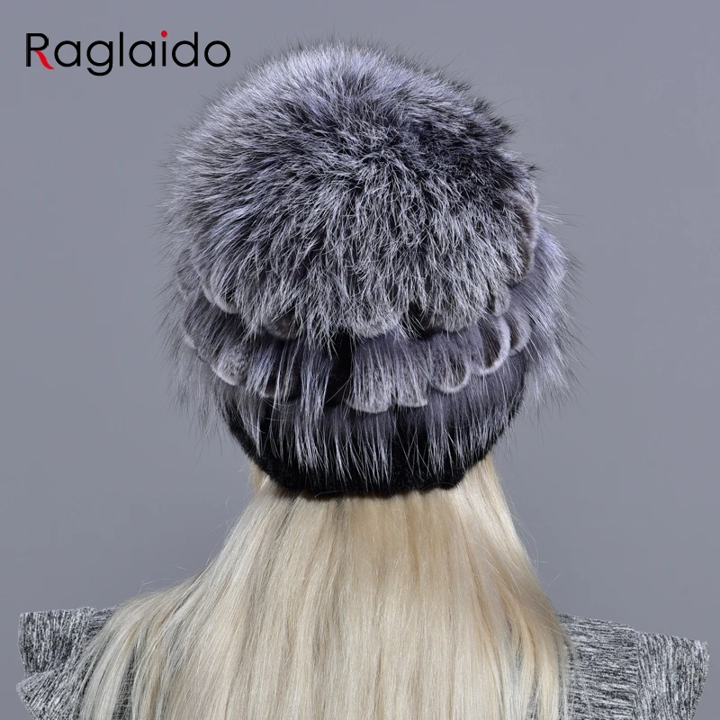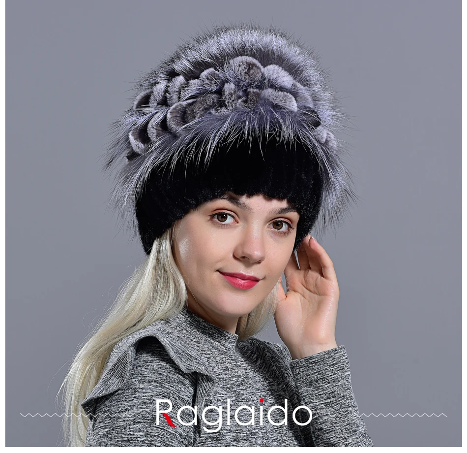 Шапка женская вязаная из натурального меха норки, с помпоном из лисьего меха