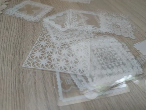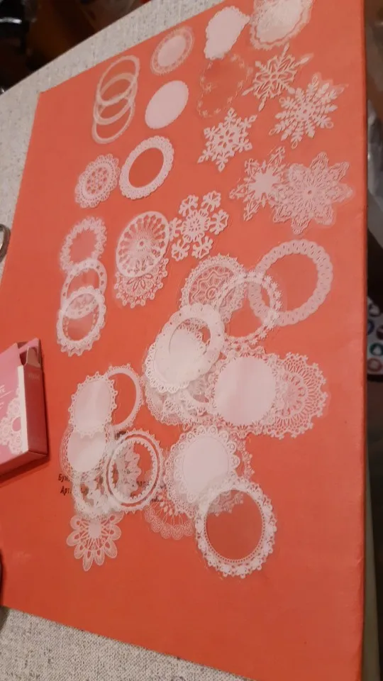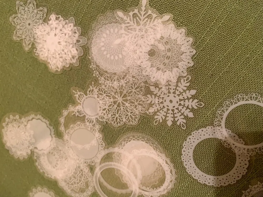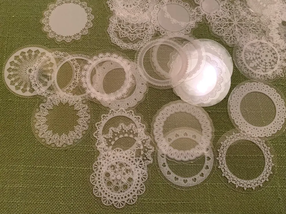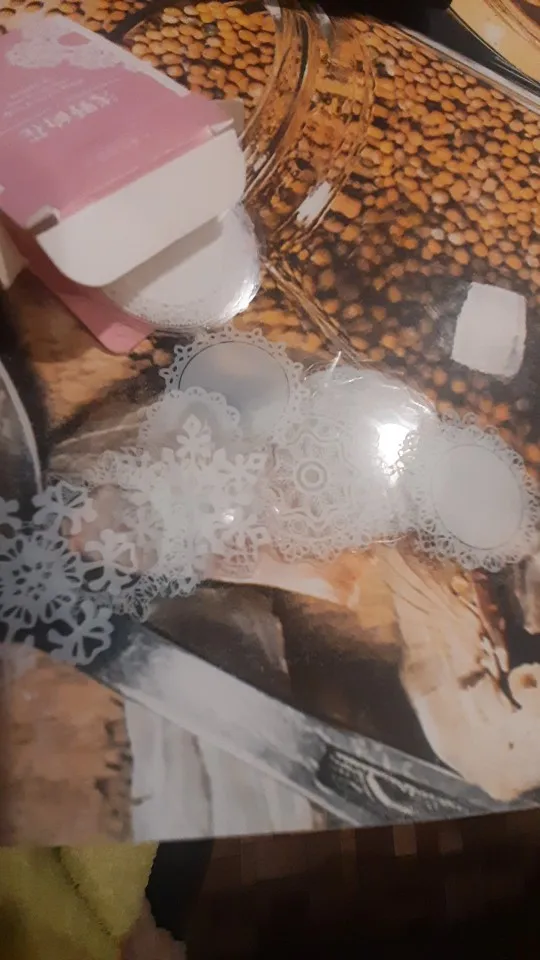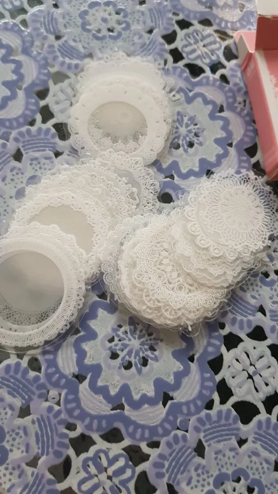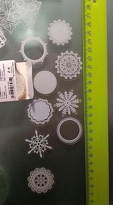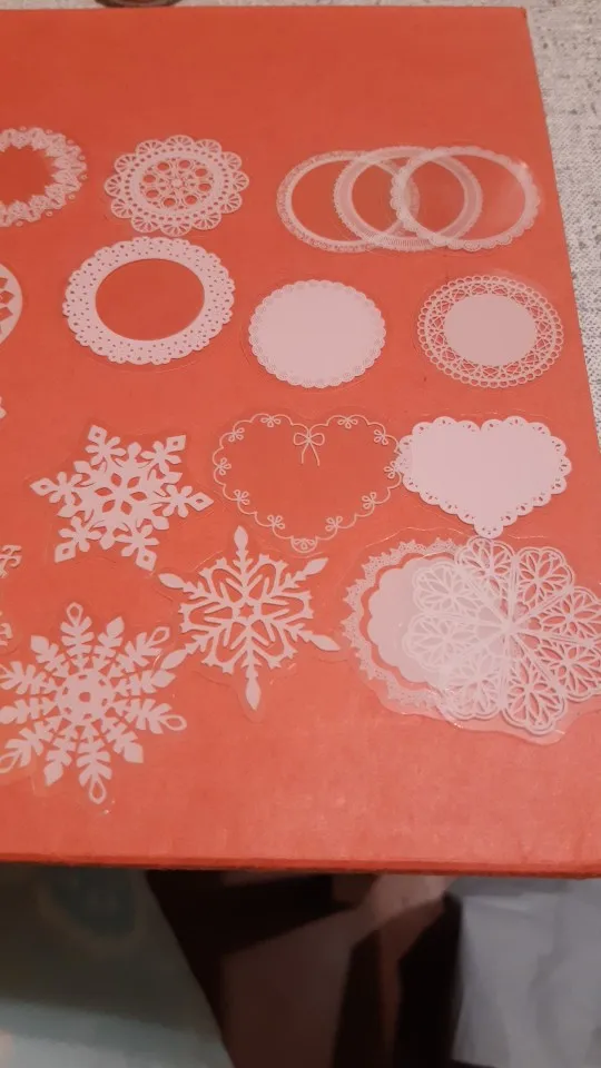 Хорошие наклейки, похожи на фото. Большинство круглые салфетки - с центром и без, но есть кружевные снежинки и сердечки) Дошло быстро и в целости.
