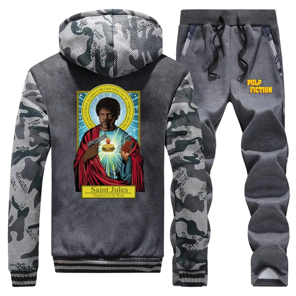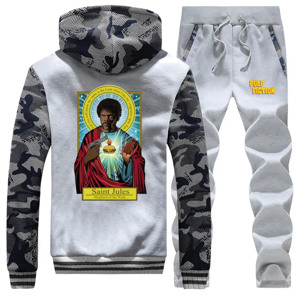 Повседневная Уличная одежда, куртки 2019, зимняя мужская куртка, плотный костюм свободного покроя с принтом Святого Миа Джулс, флисовая толстовка с капюшоном и брюки, комплект из 2 предметов