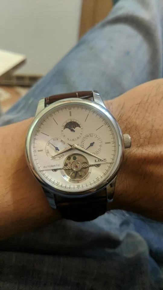 Часы мужские механические с автоподзаводом, кожаным ремешком и коробкой