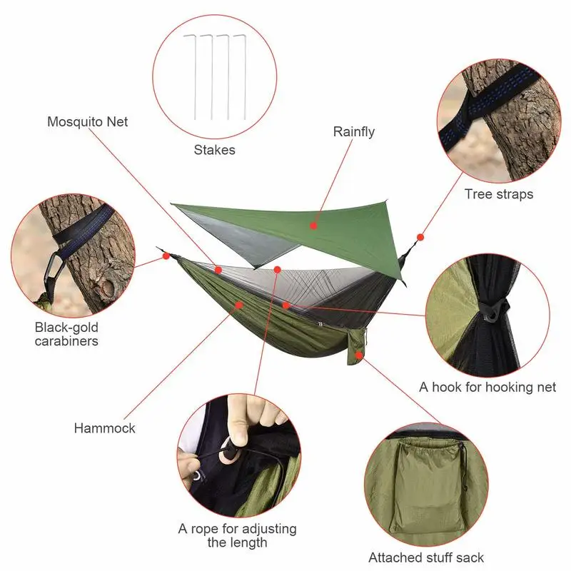 Могу с уверенностью сказать, что этот гамак для кемпинга состоит из трех основных членов: гамака, москитной сетки и зонтика. При наступлении ночи вы можете повесить москитную сетку на землю, чтобы избежать укусов комаров. Когда попадает сильный солнечный свет, вы можете настроить небо, чтобы избежать сильного ультрафиолетового излучения. Когда наступает внезапный сильный дождь, вы можете быстро установить небо, так что вы можете избежать дождя, конечно, небо также можно удалить, а затем перейти к местной площадке!