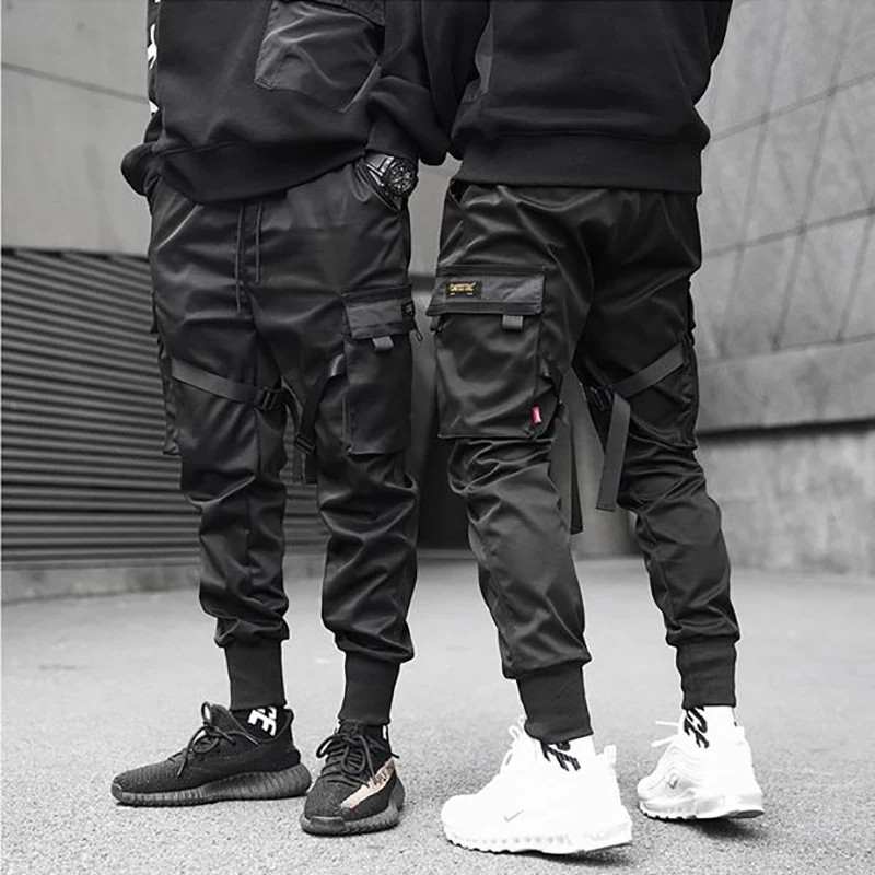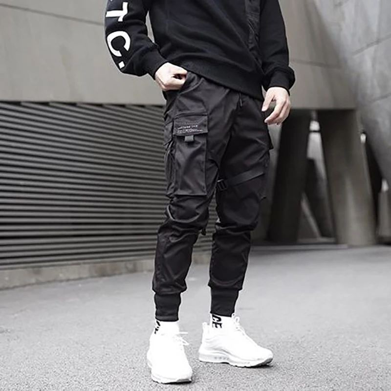 Брюки-карго мужские с лентами, черные брюки-султанки в стиле хип-хоп, спортивные Джоггеры в стиле Харадзюку, с карманами