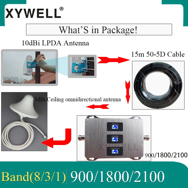 XYWELL GSM 2G 3G 4G Усилитель сотового телефона трехполосный Усилитель мобильного сигнала LTE сотовый ретранслятор GSM DCS WCDMA 900 1800 2100 набор