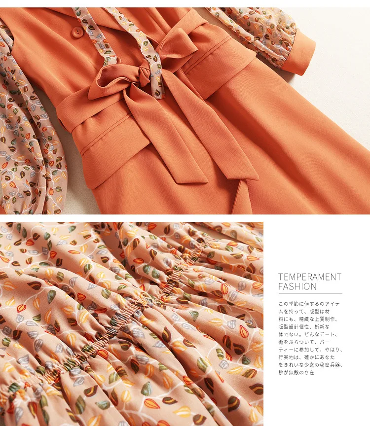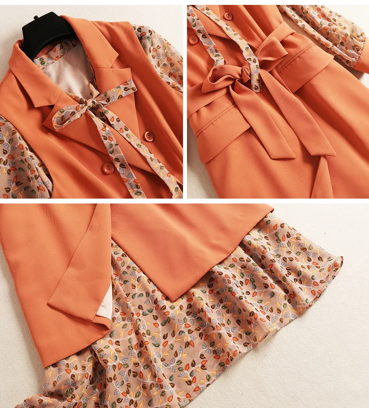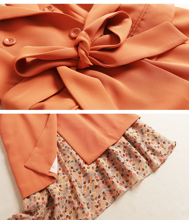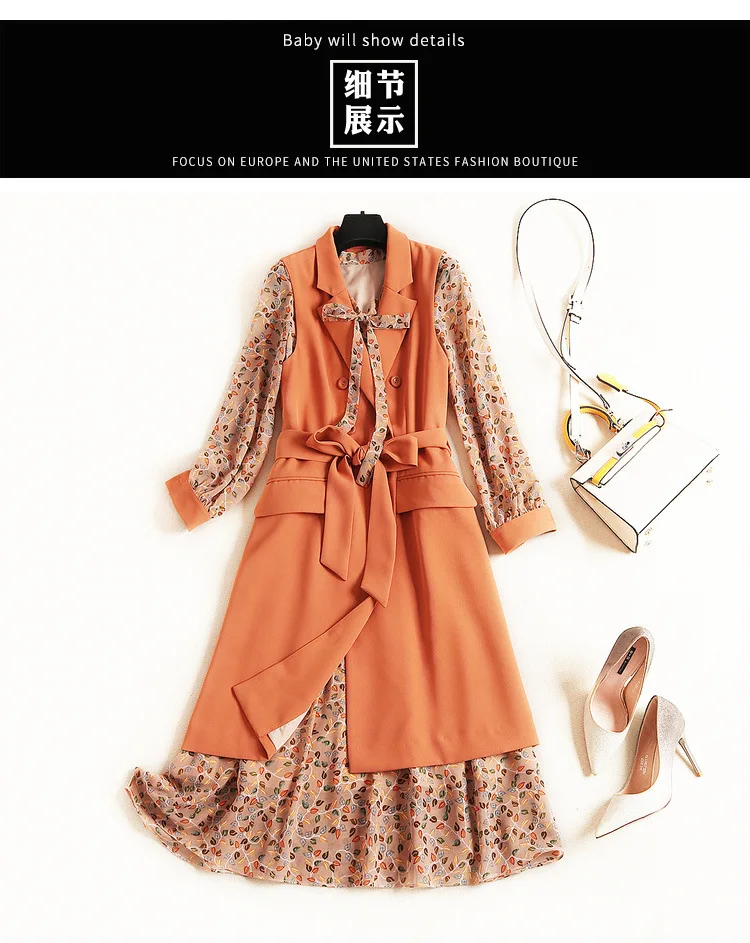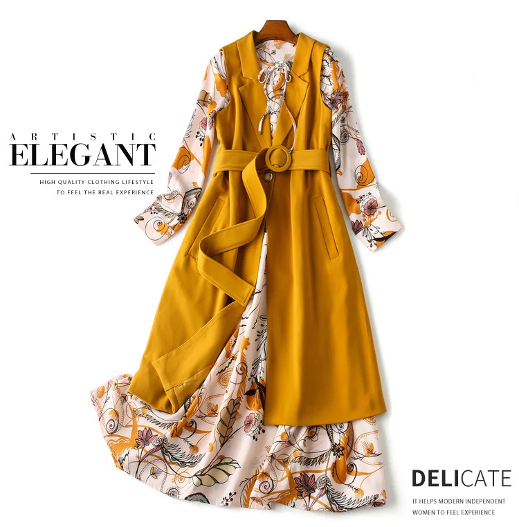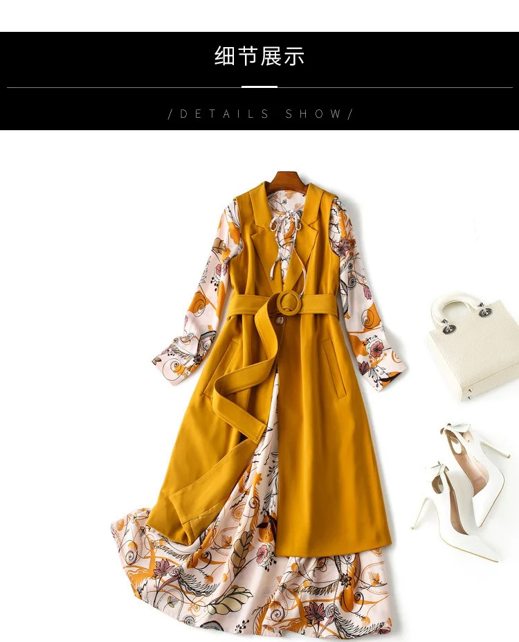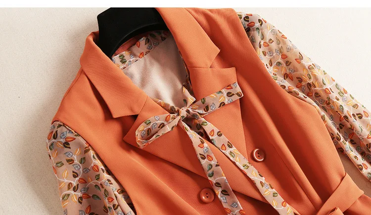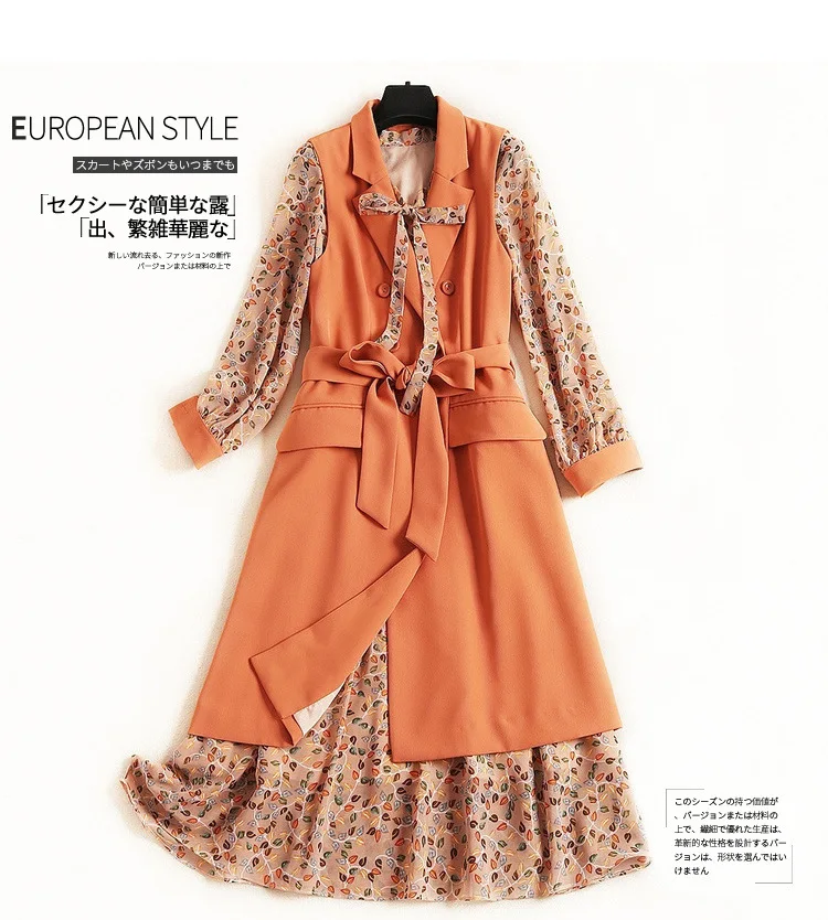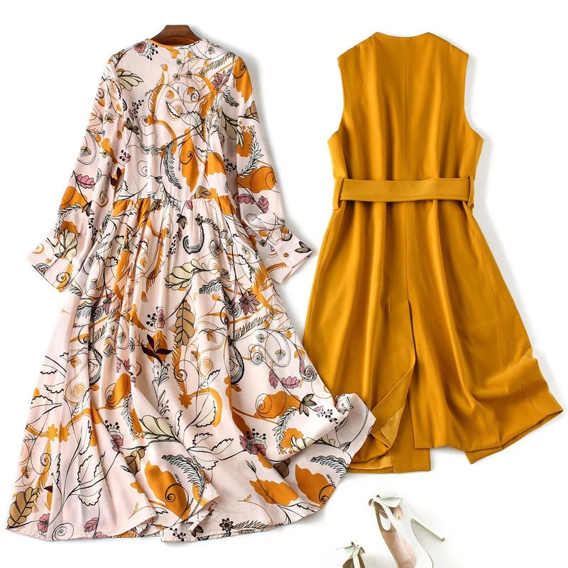 Женское шифоновое платье с бантом на воротнике, осеннее платье-трапеция с принтом, элегантный длинный жилет с поясом, комплект из двух предметов