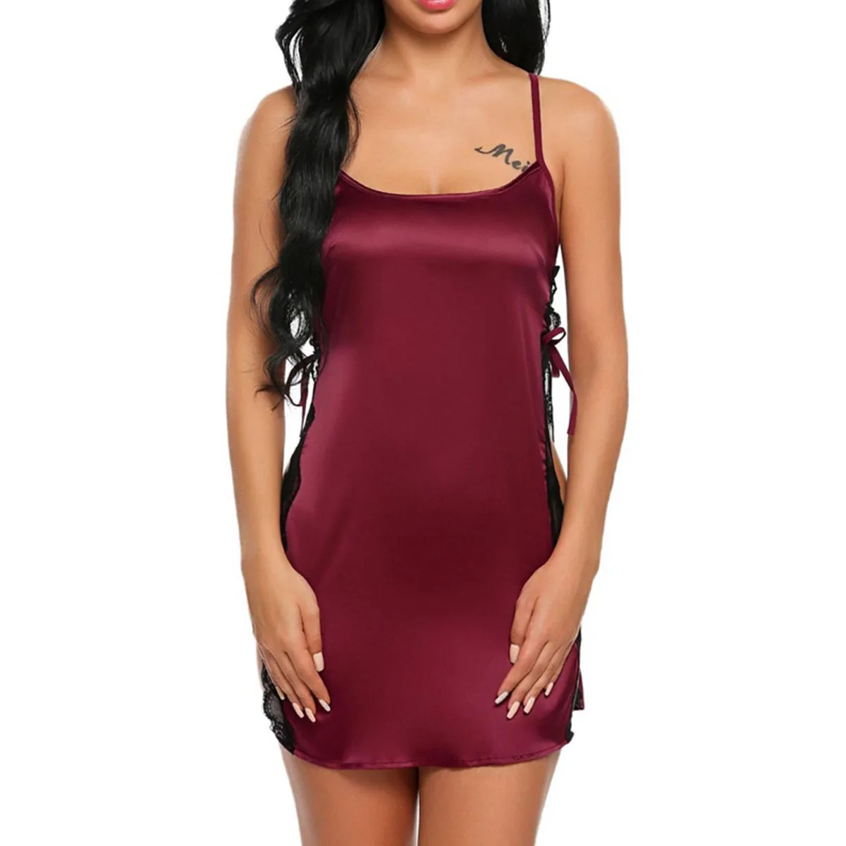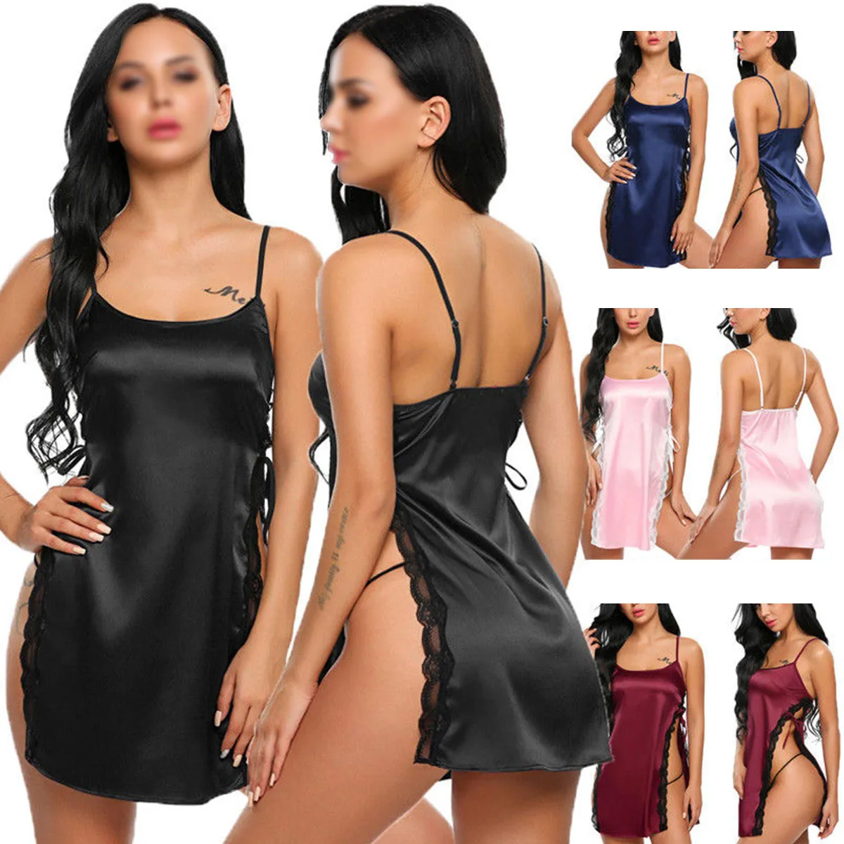 Женская сексуальная ночная сорочка из шелкового атласа, кружевные халаты для сна, сексуальное платье, боковая Пижама с разрезами