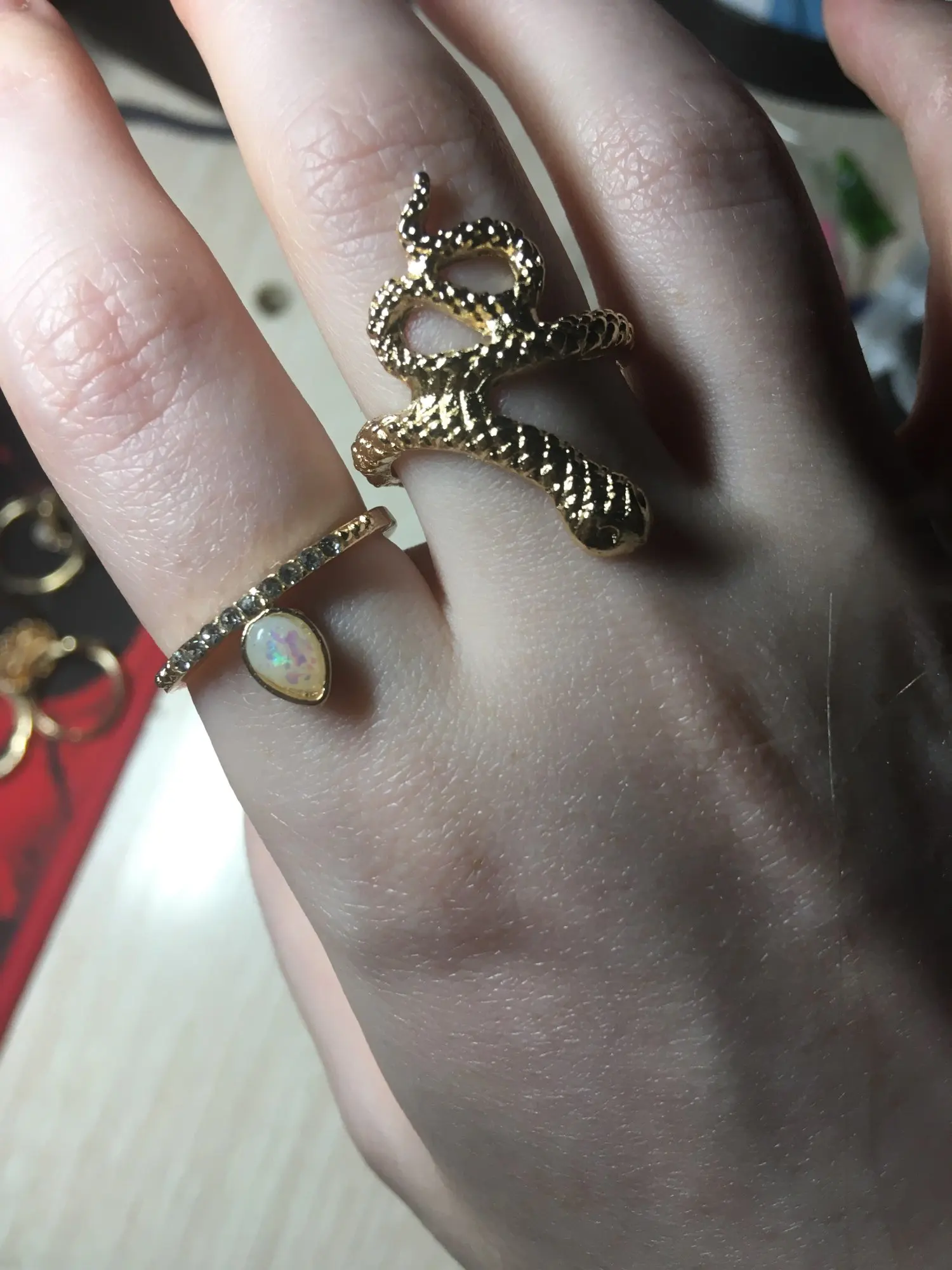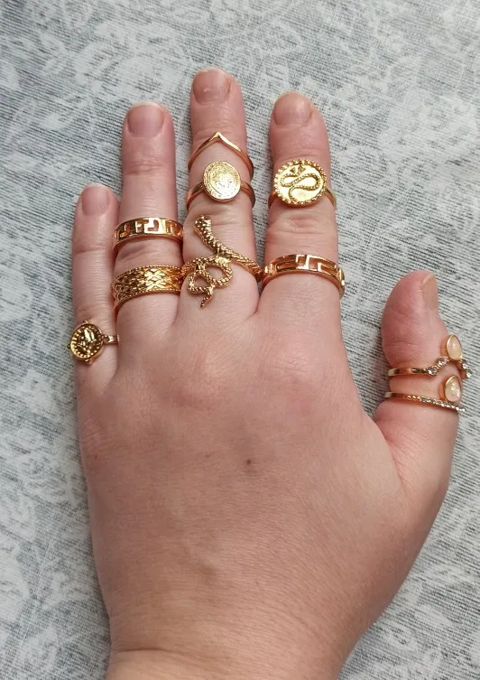 Быстрая доставка. Качество супер, цвет яркий ровный, некоторый кольца довольно весомые по весу. Одно НО, довольно большой размер у некоторых колец. Змейка комфортно была только на большом пальце. (Скорее всего 17-18 размер)