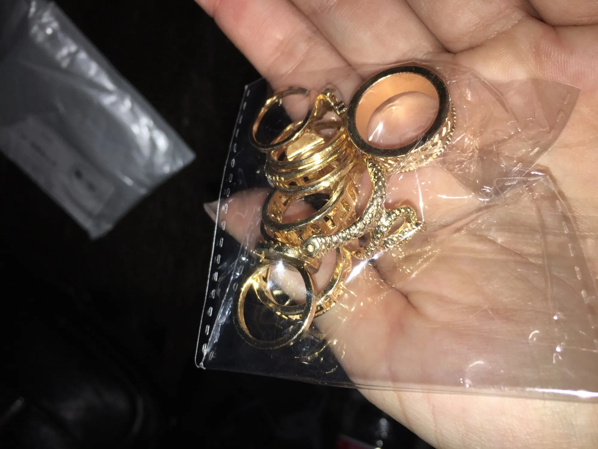 Почти месяц заняла доставка (для меня норм, мне не горело), пришло в сером пакете, в нём лежал зиплок с кольцами. Размеры разные, колец много, на обе руки на все пальцы хватит))