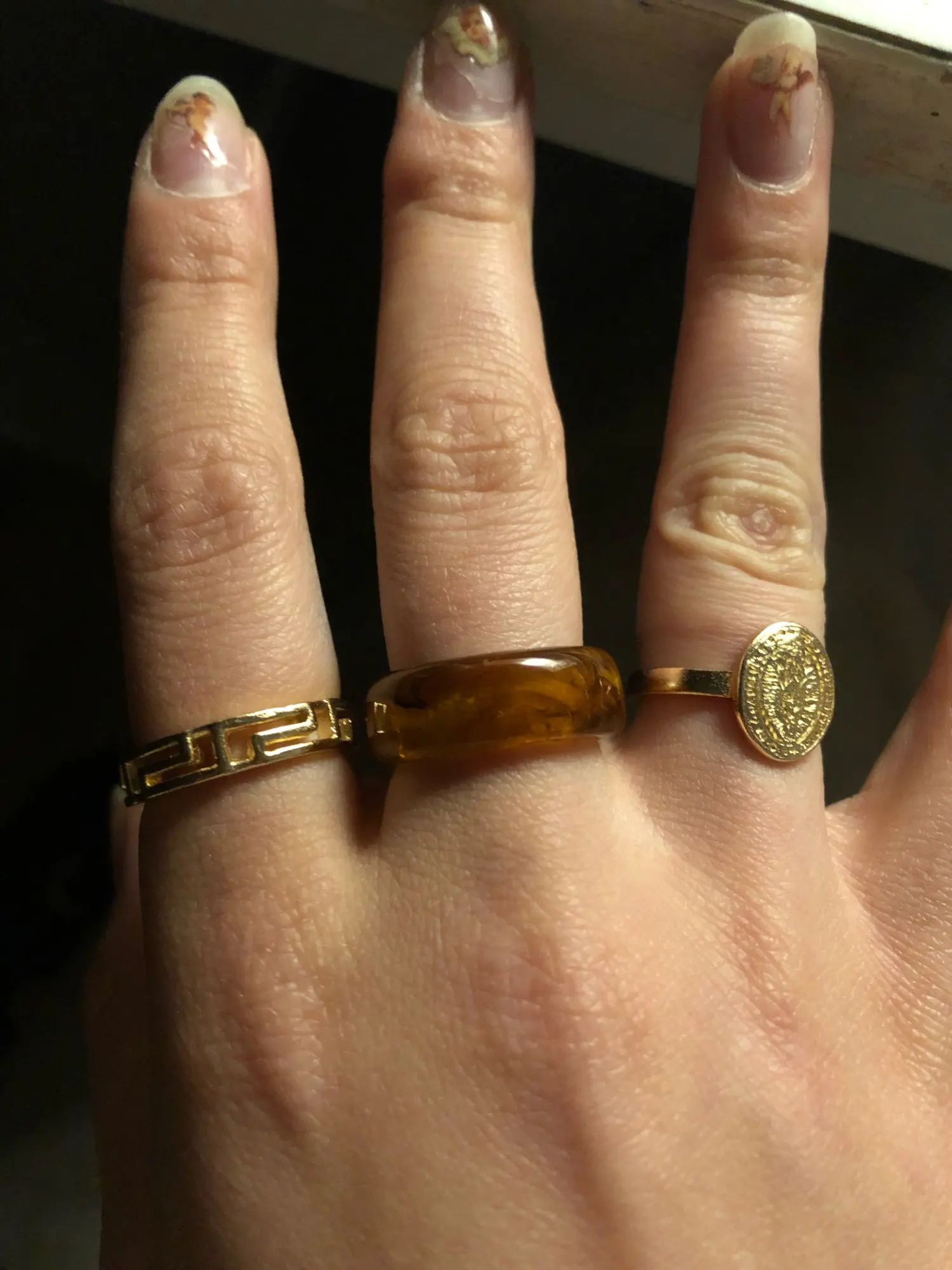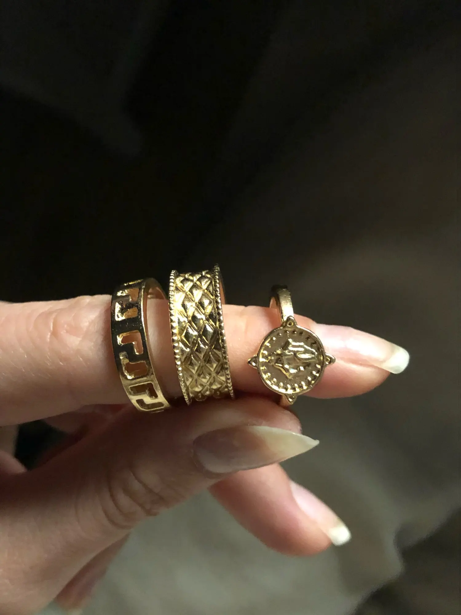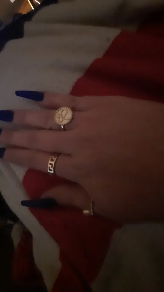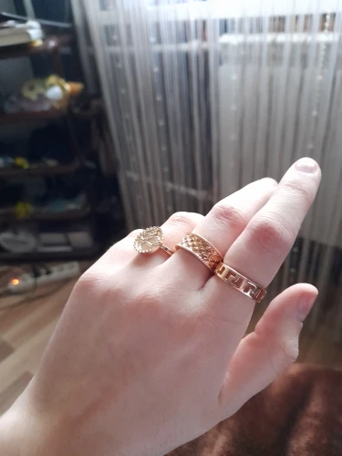 хорошие кольца, тяжелые для дешевого металла, очень похожи на золото, некоторые оставляют серый след на пальцах, но на тонкие пальцы большие и основном приходится носить на указательном и большом