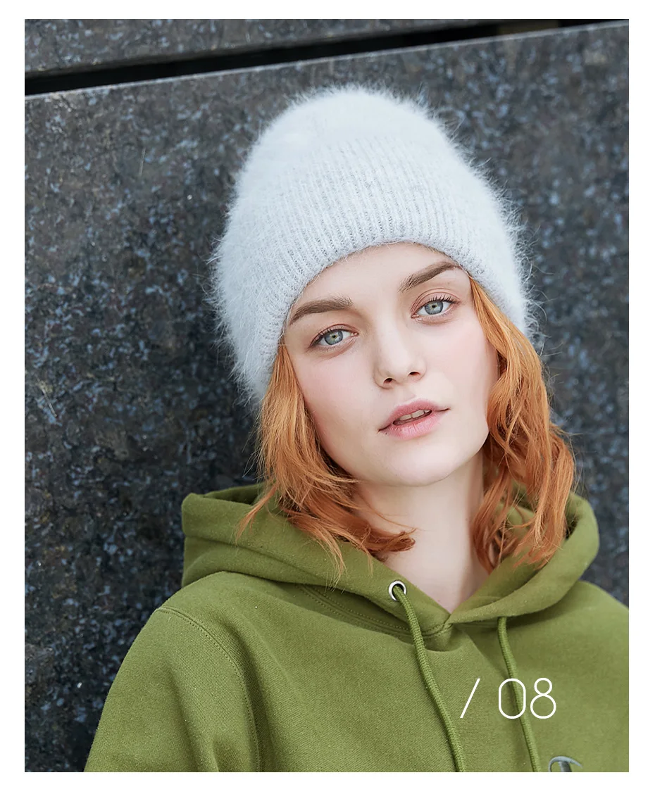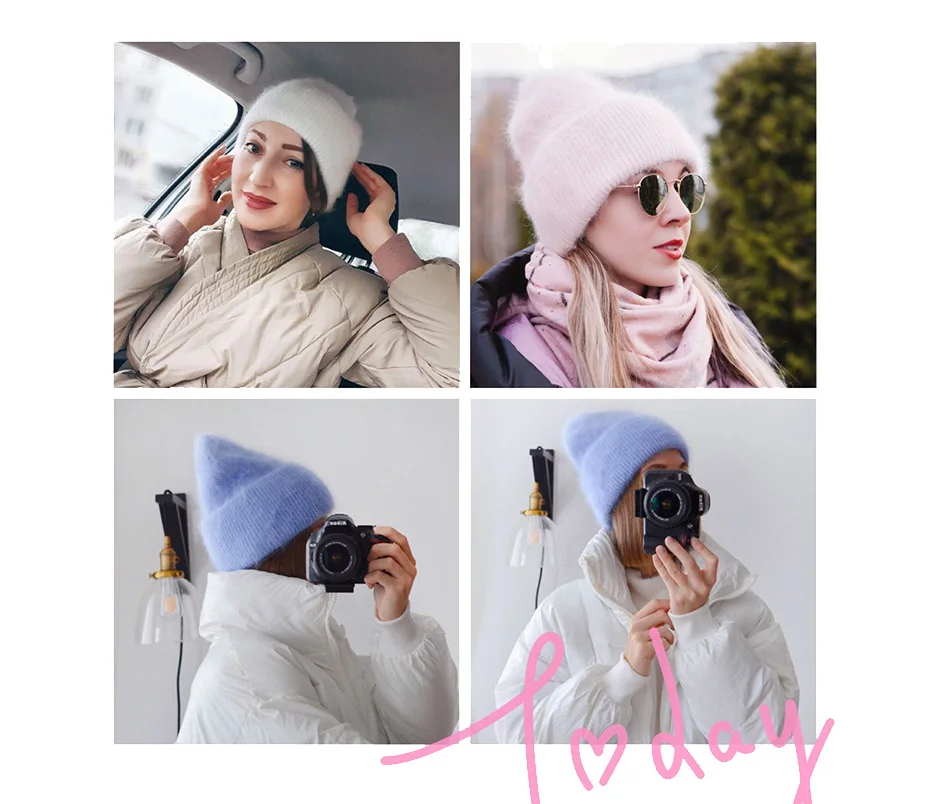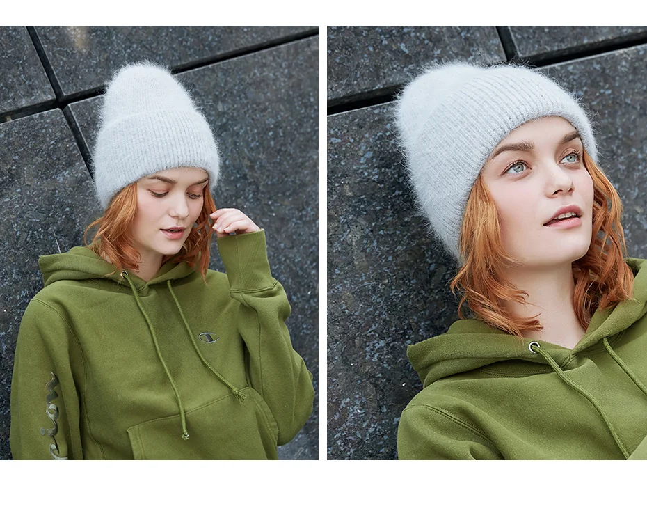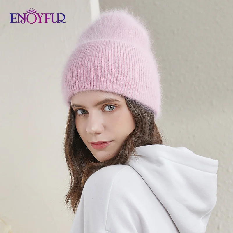 Шапка бини Женская ENJOYFUR, однотонная, теплая, с длинным кроличьим мехом, с широкими манжетами, для зимы