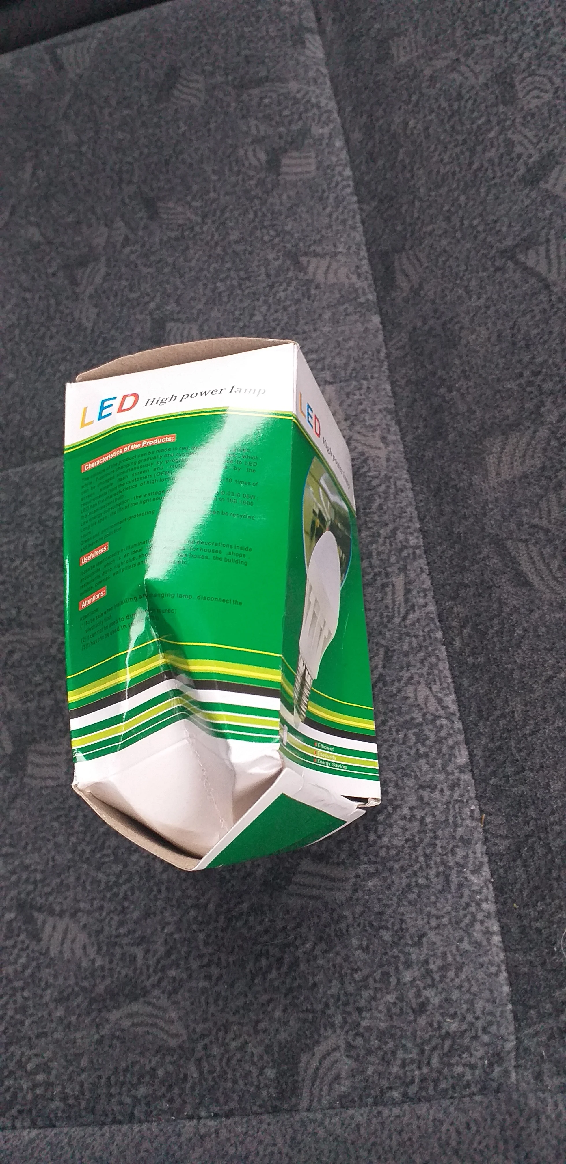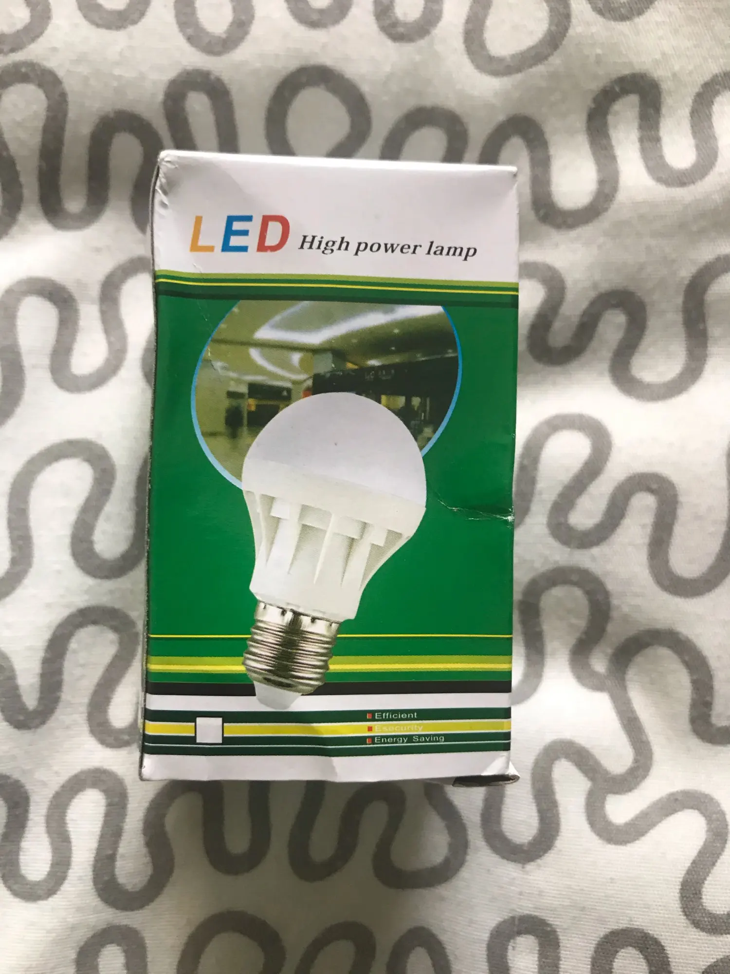 Коробка помятая в хлам, но лампа целая и работает. Светит лампа ярко, включается корректно, брать можно.