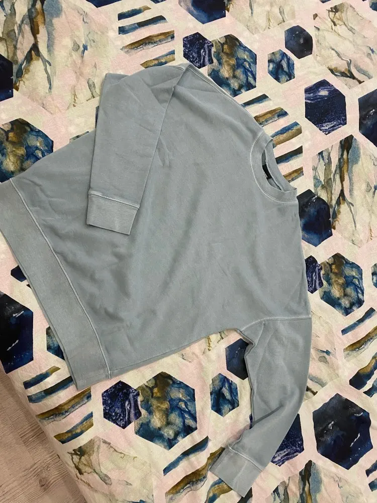 обычная х/б кофта, ничего необычного. да еще этот зеленый цвет выглядит, как застиранный, напоминает пижаму. если бы купила за полную стоимость, то расстроилась бы, а за 500 руб пойдёт