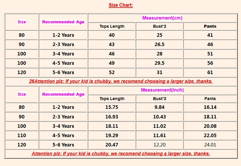 Размер Рекомендуемый возраст Размер (см) Длина топа; Длина Размер бюста * 2 Брюки для девочек 80 Для детей от 1 до 2 лет 40 25 41 90 От 2 до 3 лет 43 26,5 46 100 От 3 до 4 лет 46 28 51 100 От 4 до 5 лет 49 29,5 56 120 От 5 до 6 лет 52 31 61 26. Обратите внимание: если ваш ребенок пухленький, мы рекомендуем выбрать больший размер, спасибо. Размер Рекомендуемый возраст Измерение (в дюймах) Длина топа; Длина Размер бюста * 2 Брюки для девочек 80 1-2Лет 15,75 9,84 16,14 90 2-3Лет 16,93 10,43 18,11 100 3-4Лет 18,11 11,02 20,08 110 4-5Лет 19,29 11,61 22,05 120 5-6Лет 20,47 12,20 24,01 Обратите внимание: если ваш ребенок пухленький, мы рекомендуем выбрать больший размер, спасибо.