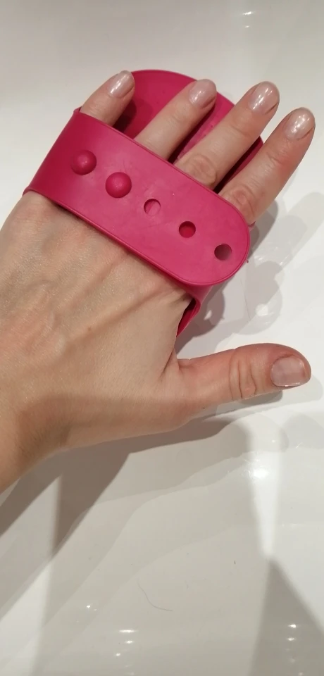 Удобно держится на руке. Отлично подходит и для душа и для самомассажа по маслу.