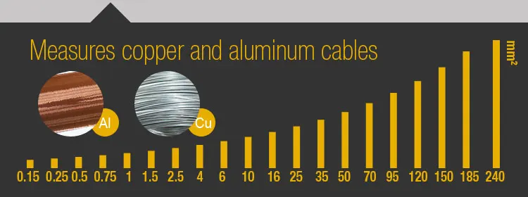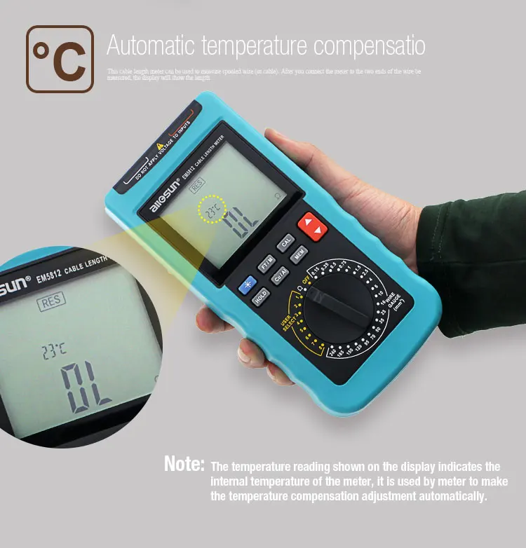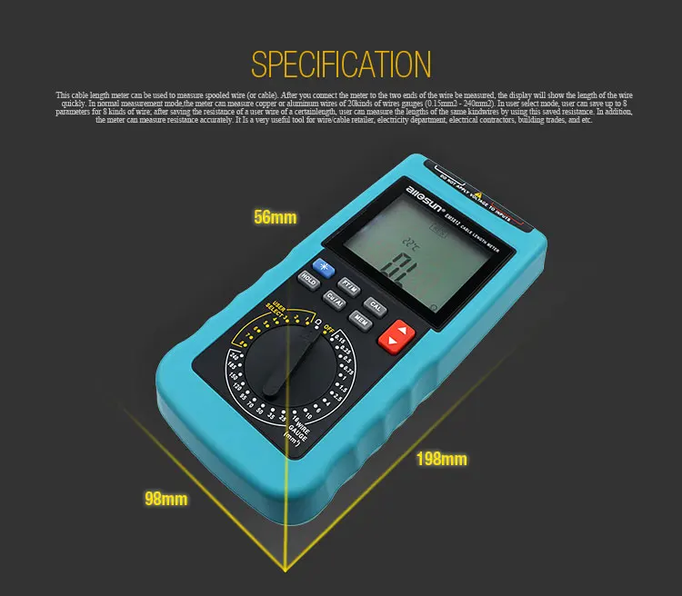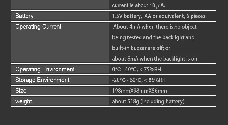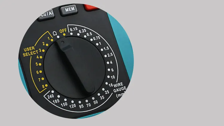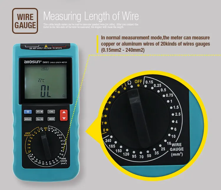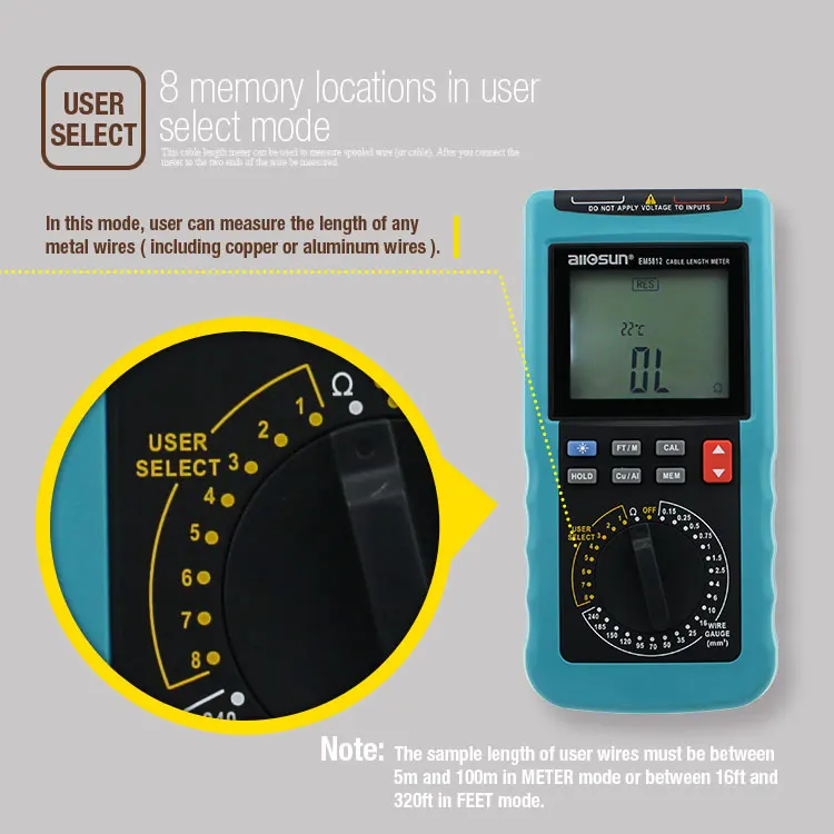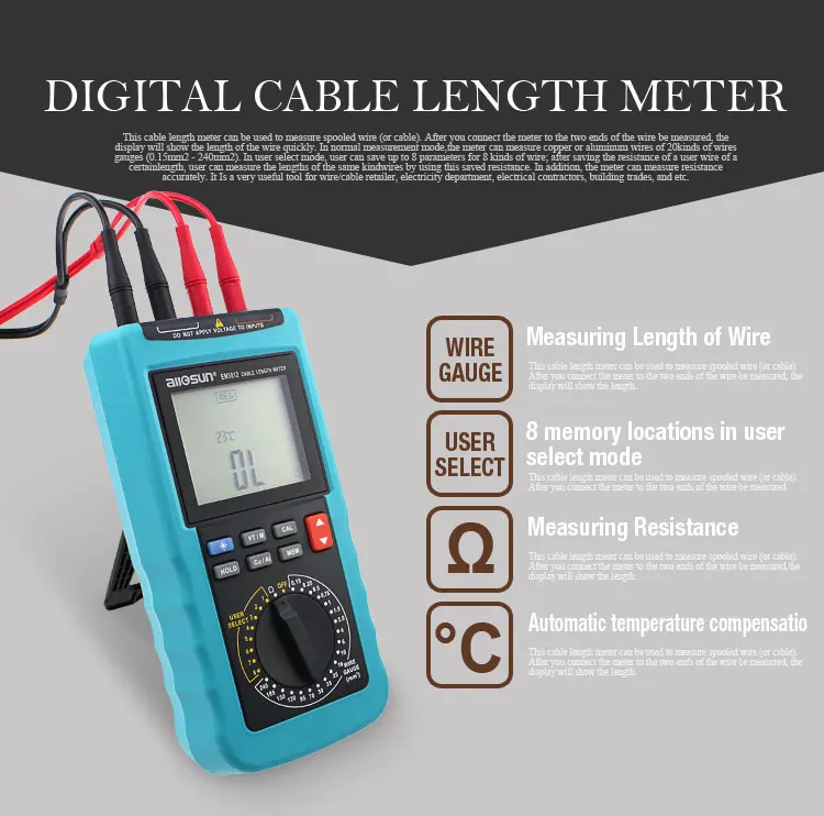 Особенность1. Встроенный зуммер, подсветка и 4-значный дисплей с 1/2 цифрами2. Считывает в футах и метрах3. Измеряет медные и алюминиевые кабели4. 8 мест памяти в режиме выбора пользователя5. 20 настроек предварительно установленного датчика провода:18AWG, 16AWG, 14AWG, 12AWG, 10AWG, 8AWG, 6AWG, 4AWG, 2AWG, 1/0, 2/0, 3/0, 4/0, 250kcmil, 350kcmil, 400kcmil, 500kcmil, kcmil, 600kcmil, 750kcmil, 1000kcmil6. Автоматическая температурная компенсация