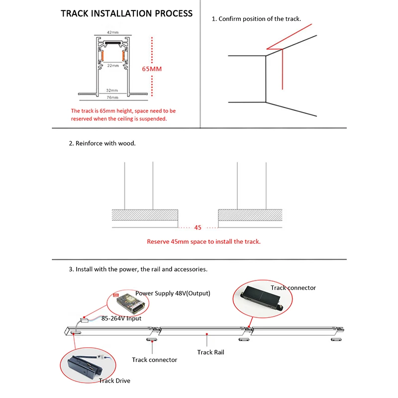 Установка: встраиваемая, подвесная, поверхностная.Мощность рельса: 48 В, может касаться напрямую.Характеристики: передвижной, вы можете положить куда угодно. Добавление/уменьшение света.(Мы предоставим вам бесплатный источник питания 100-260 в.)