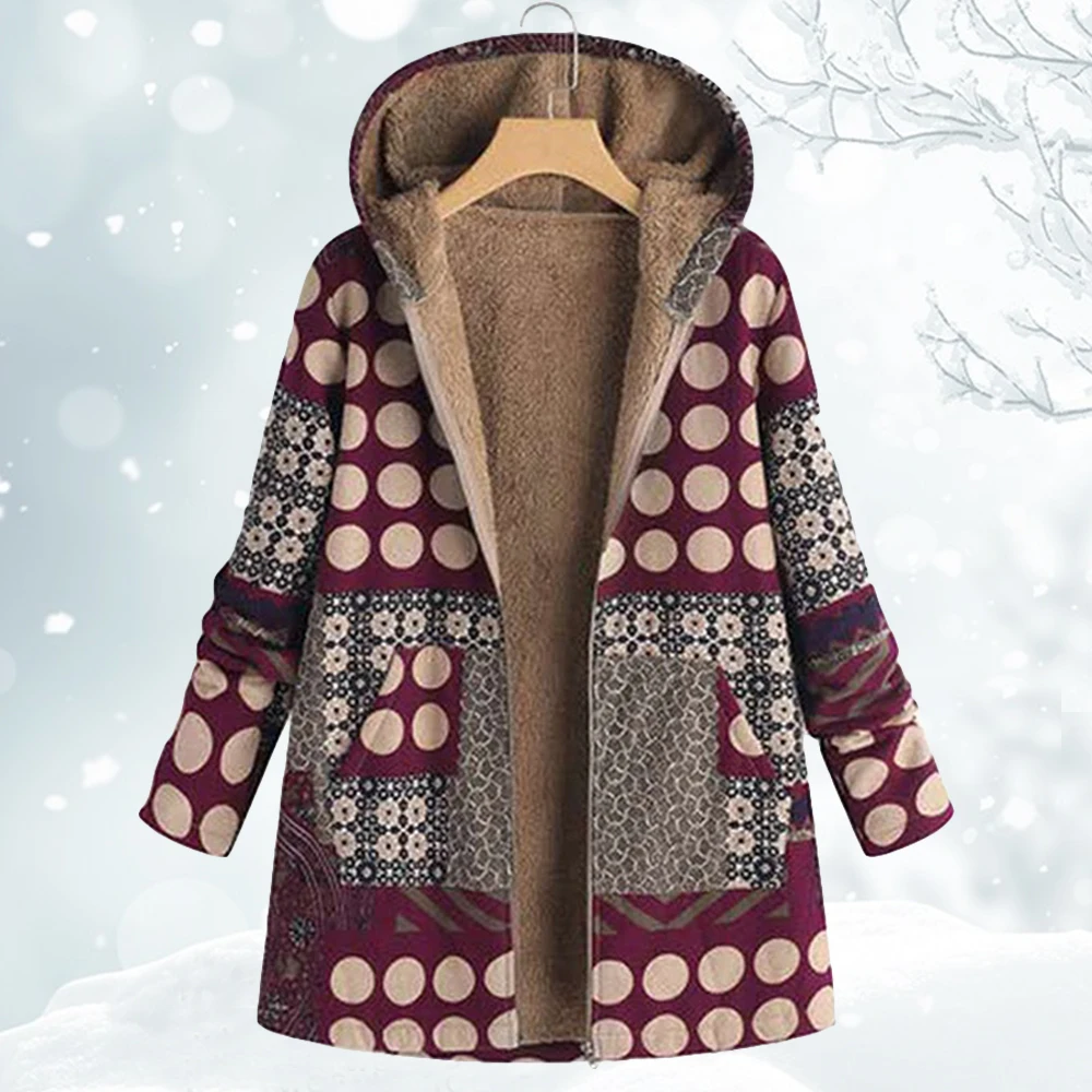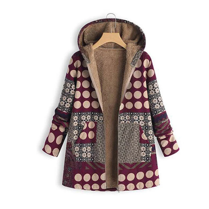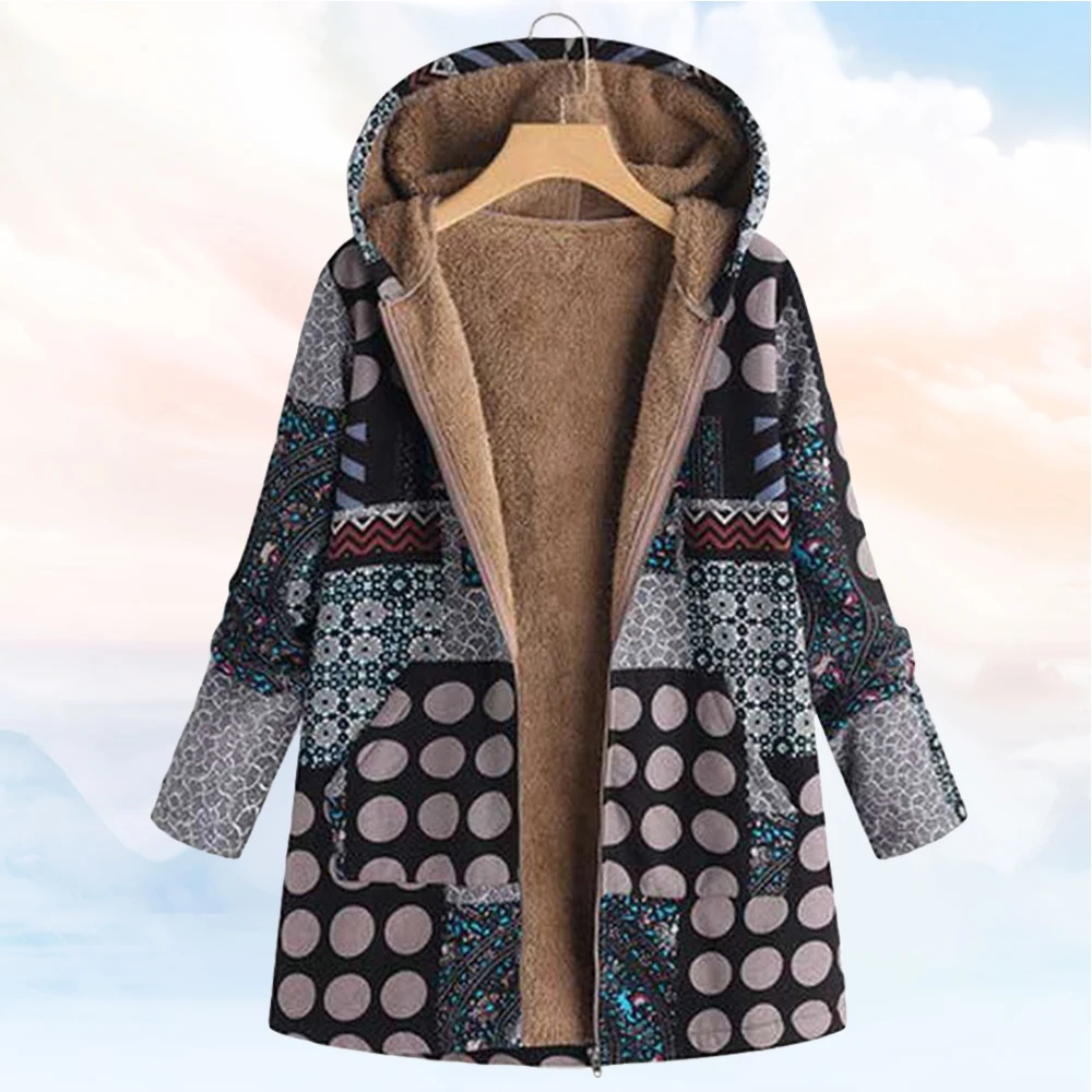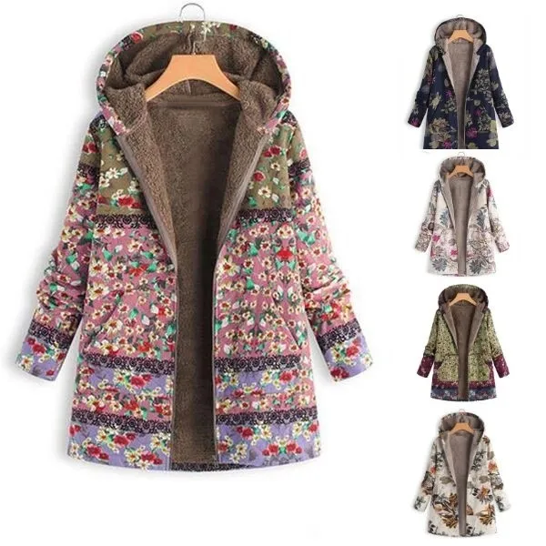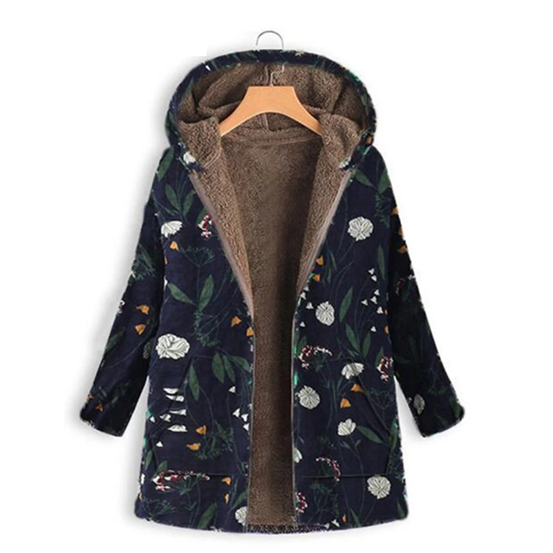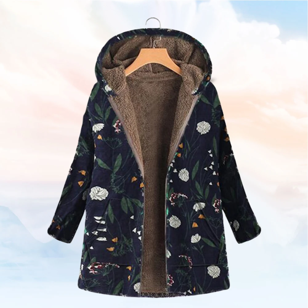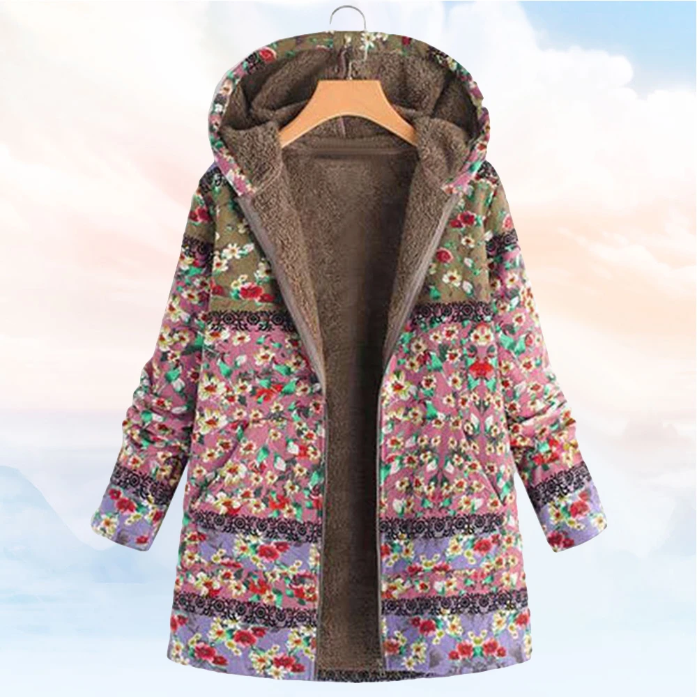 Парка с цветочным принтом, Женская винтажная куртка с длинным рукавом, пушистое пальто на молнии с капюшоном, Женское зимнее теплое платье с карманами