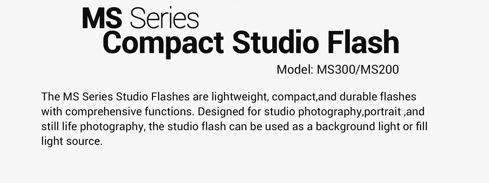 Студийные вспышки серии MS легкие, компактные и прочные вспышки с широкими функциями, предназначенные для студийной потографии, портретной и натюрмортной фотографии, студийная вспышка может использоваться в качестве фонового света или заполняющего источника света.