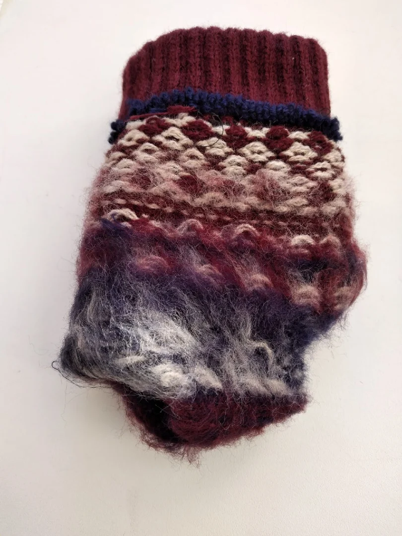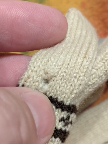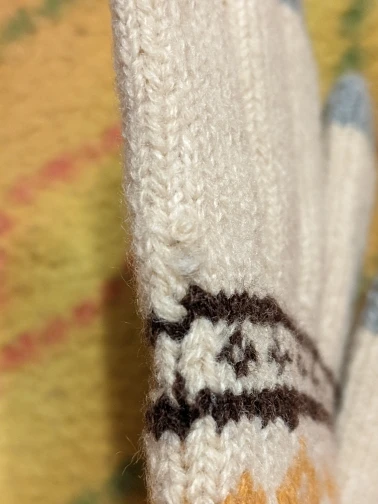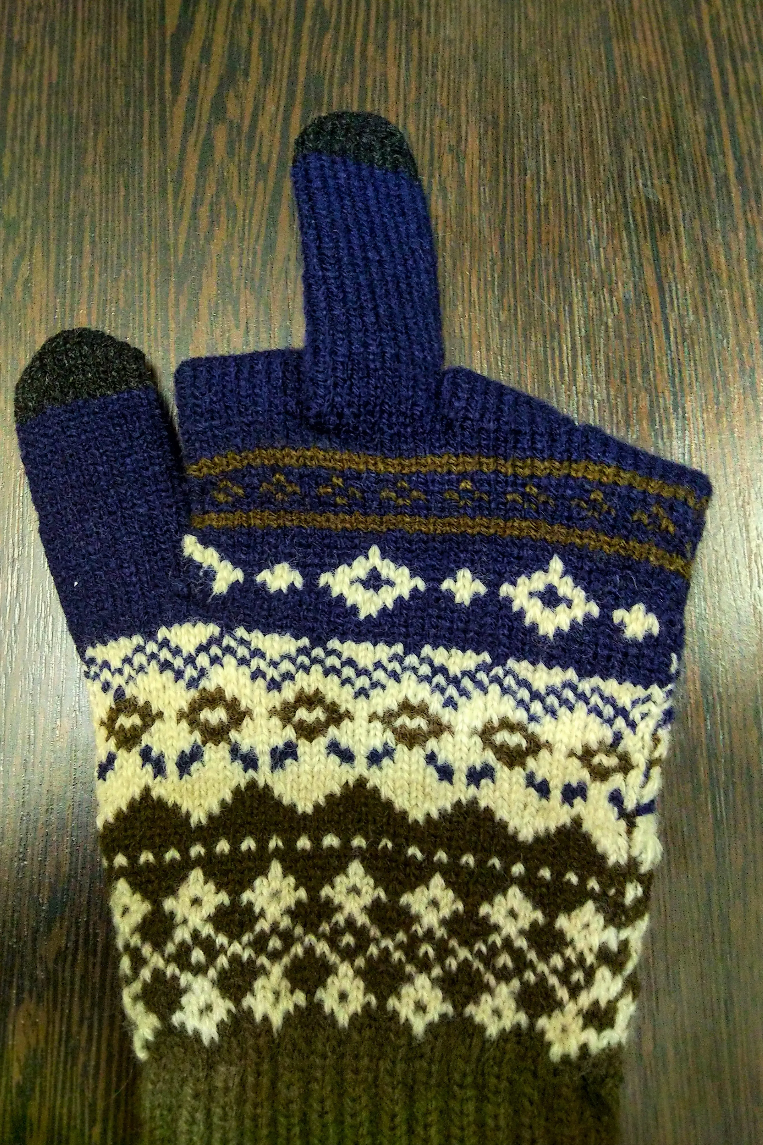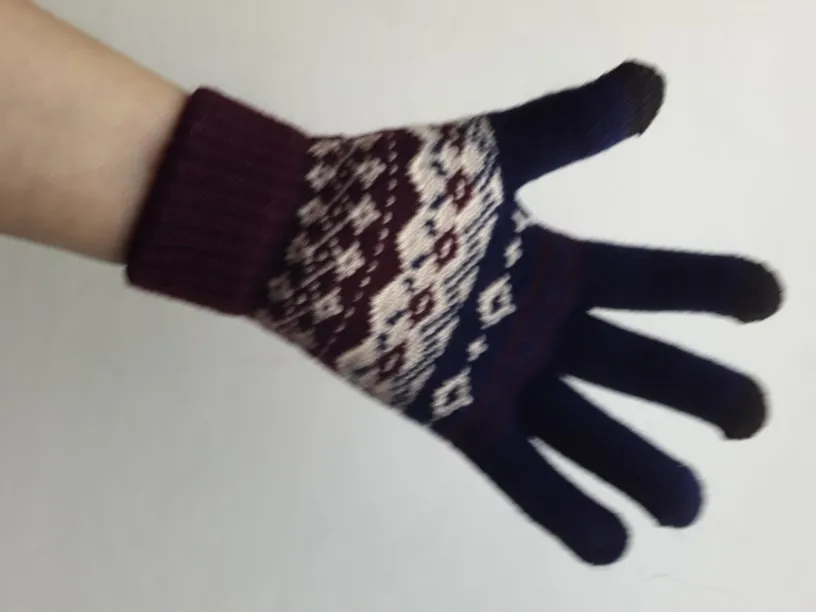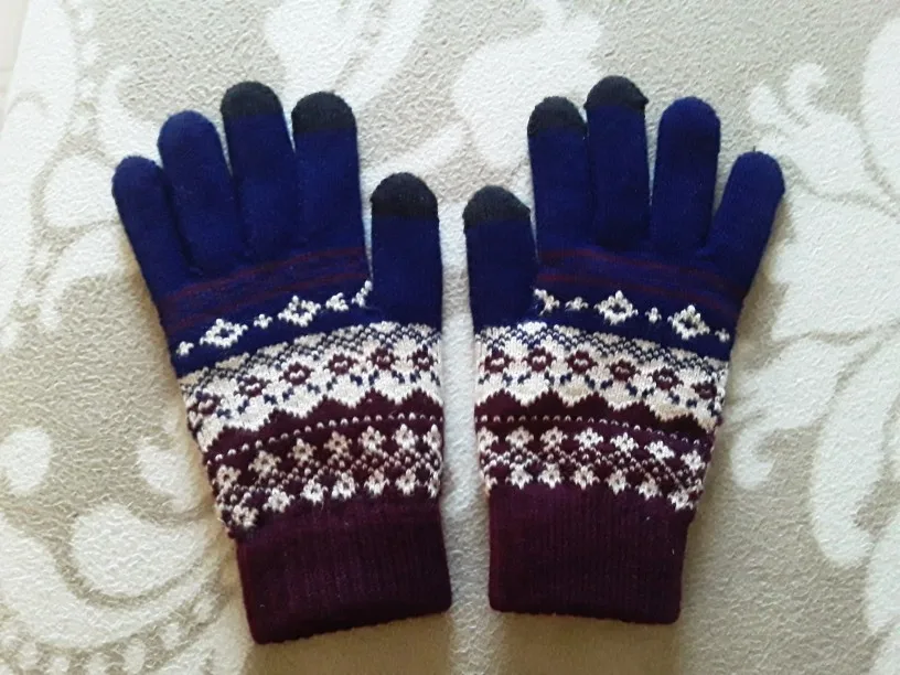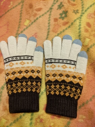 Перчатки без дефектов. Довольно толстые, но это плохо греющая синтетическая толщина. Цвета не такие чистые, как на фото, угрюмые, и заметен плоский блеск акрила. Тем не менее, они не страшненькие, аккуратные, сколько-нибудь греют, и за 200 р.