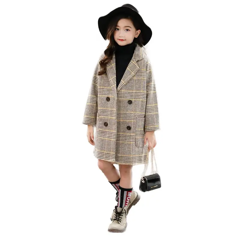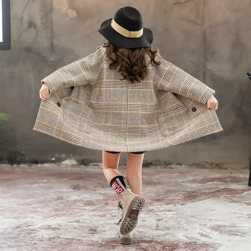 Детская одежда пальто для девочек Новинка 2020 года, зимняя куртка для маленьких девочек повседневное шерстяное пальто в клетку с воротником-стойкой на осень