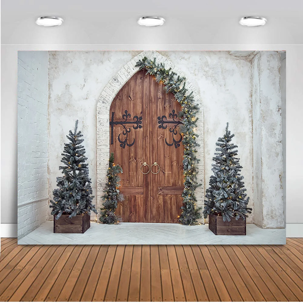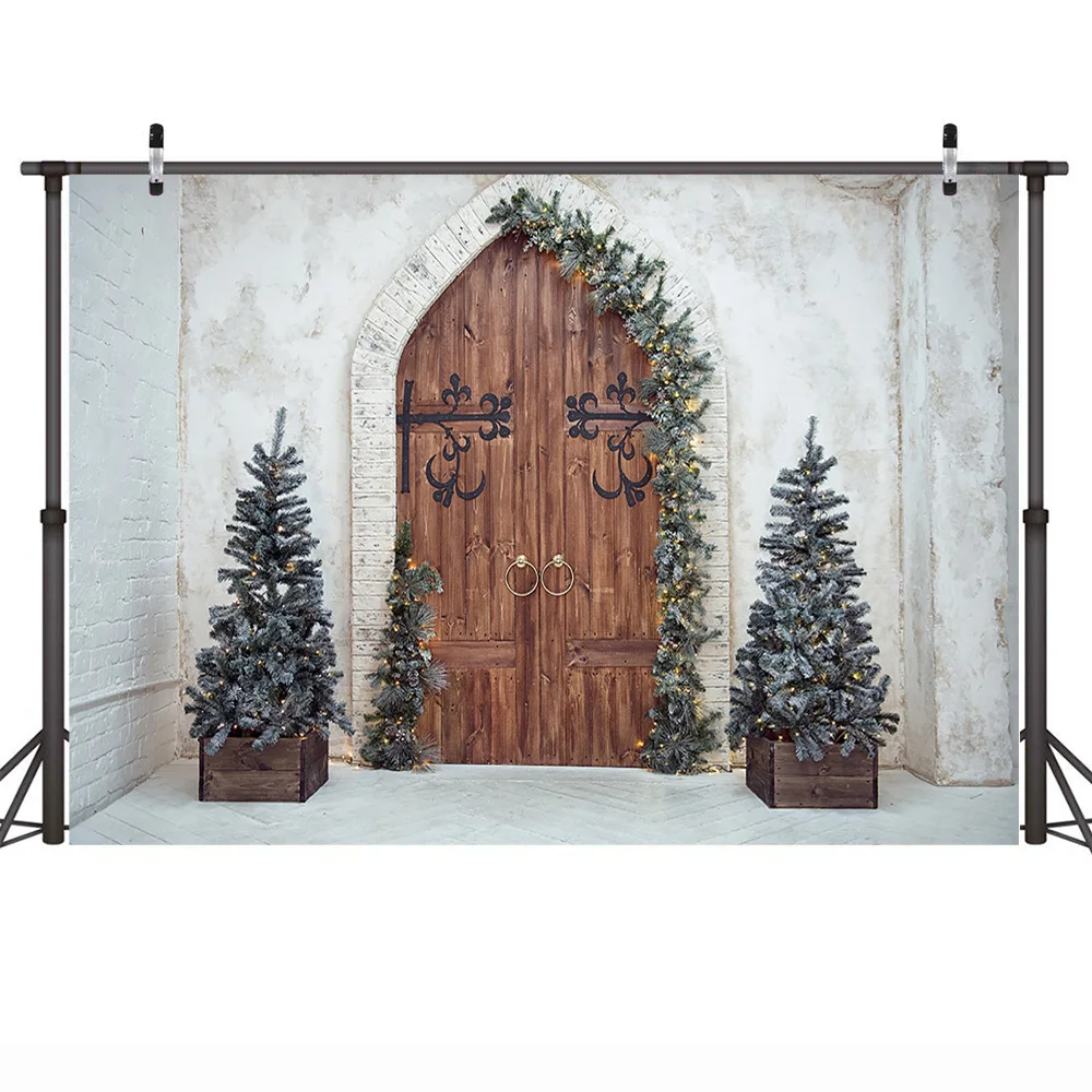 Рождественский фон для фотосъемки Рождественское украшение дерево Ретро Винтажные деревянные двери Рождественские фоны для фотостудии