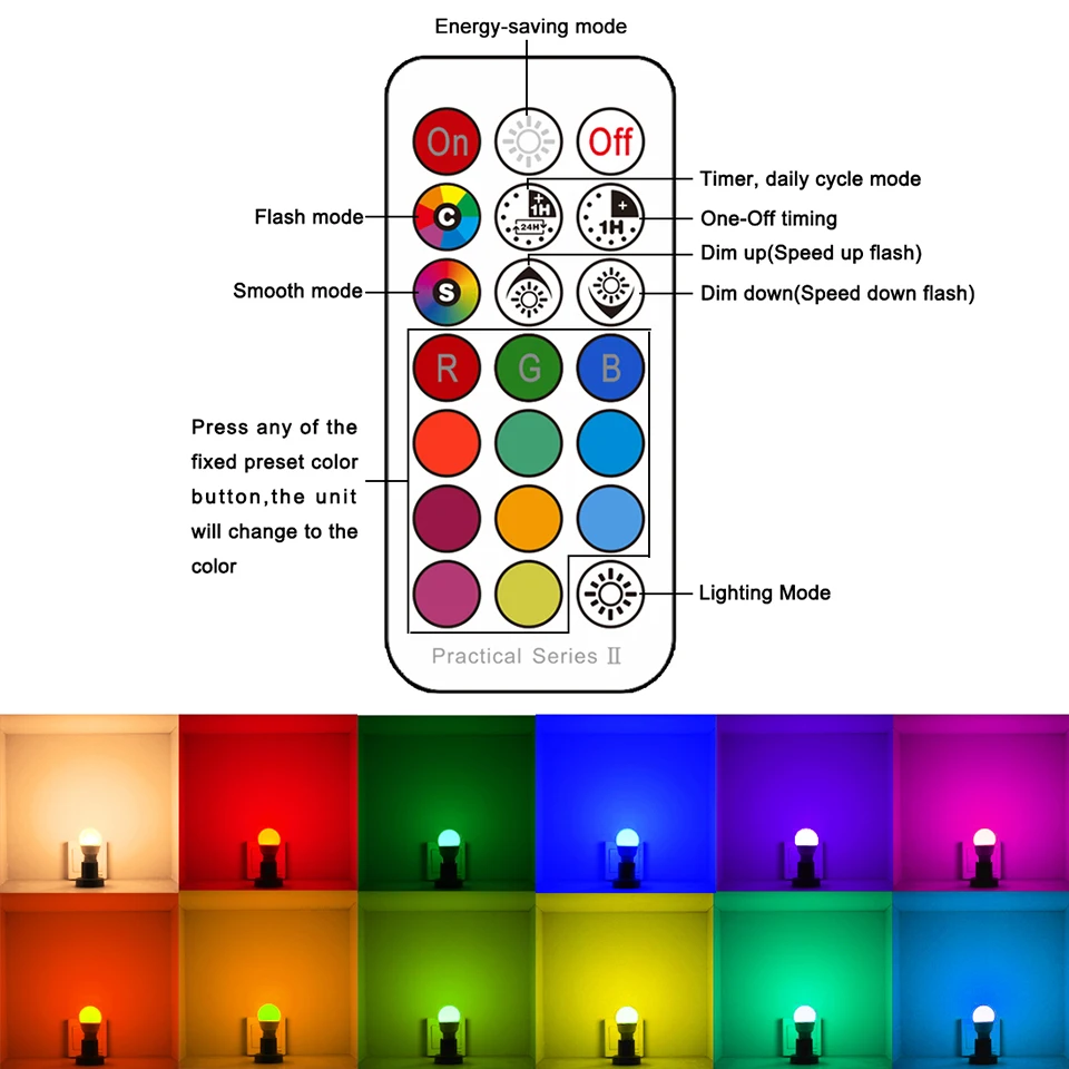 УдобсветильникИндекс цветопередачи (CRI) лампы составляет более 80, чем выше CRI, тем реалистичнее кажутся цвета невооруженным глазом. 5700K холодный белый (или 2700K теплый белый) и высокий CRI лампы делают домашнюю обстановку очень расслабленной и комфортной.12 цветов с ИК-пультом дистанционного управления12 видов статичных цветов могут быть установлены кнопками регулировки цвета на контроллере, просты в эксплуатации. Вы можете выбрать понравившиеся цвета по-разному. Легче управлясветильник Том с помощью ИК-пульта дистанционного управления, одним пультом дистанционного управления можно управлять более чем одной лампочкой!Два регулируемых режимаЛампочка имеет четыре режима на выбор: статический, мигающий, стробоскопический и затухающий (плавный режим такой же, как и затухание). Вспышка иногда динамичная, а иногда мягкая, может удовлетворить больше атмосферных условий. Стробоскоп Динамический и имеет пять передач. Когда вы собираетесь провести вечерние, вам это понравится! Гладкая мягкая и нежная, делая атмосферу более расслабленной. Подходит для семьи во время отдыха, видеосъемки в прямом эфире или занятий йогой. Он настолько широко используется, что идеально подходит для баров, KTV, сцены и всех клубов, казино, ресторанов, кафе, дня рождения, свадебного банкета, праздничного освещения, для внутреннего и наружного декора.Запоминаемый цветВниз светильник поможет вам запомнить цвет лампы, когда вы в последний раз выключили светильник. Перед выключением светильника цвет красный, при повторном включении светильник льник все еще красный.Низкое потребление высокая яркостьОчень низкое тепловыделение, экономия светильник вой энергии. Энергосберегающая и Экологически чистая, способствует переработке. Лампочки с низким энергопотреблением, высокой яркостью и энергоэффективностью. Самая темная яркость лампы-это яркость 1% белого светильник.Абажур «Все включено»Светильник представляет собой полностью закрытые абажуры, которые не скапливают пыли и не позволяют комарам залетать в поврежденные лампы и чипы.