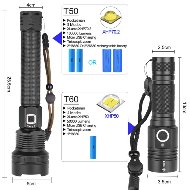 Самый мощный светодиодный фонарик XHP70 с зарядкой от USB, масштабируемый фонарик XHP50, ручная лампа, фонарик с аккумулятором 26650 18650