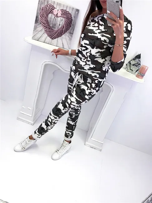 Женский комплект с длинным рукавом, футболка с высокой талией, длинные штаны, Новый леопардовый Камуфляжный повседневный комплект размера плюс, 2019