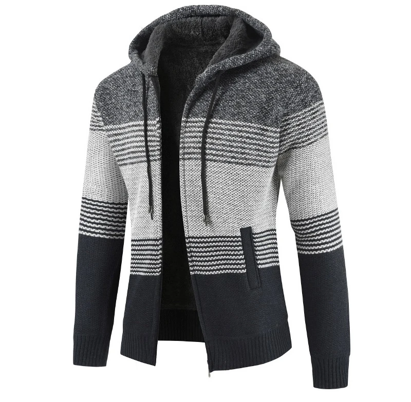 Мужской утепленный кардиган с капюшоном, кашемировая кофта с подкладкой из шерсти и флиса, в полоску, в стиле пэчворк, зима 2019
