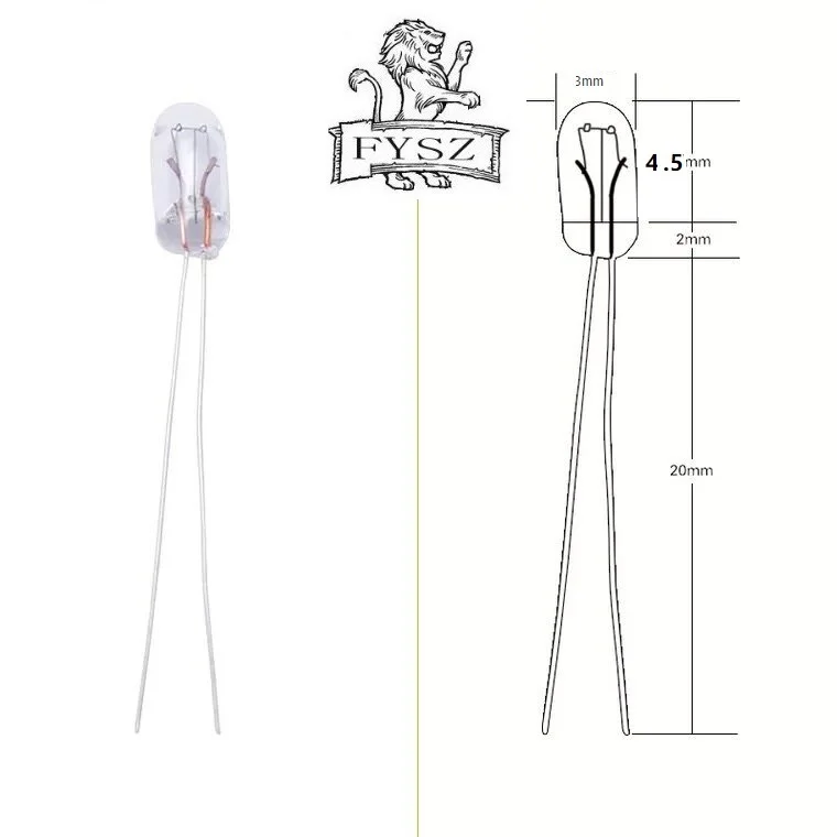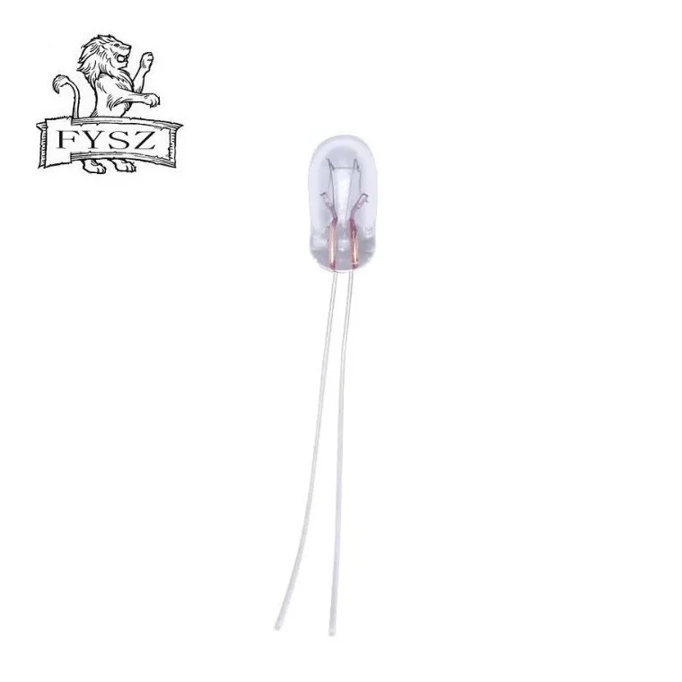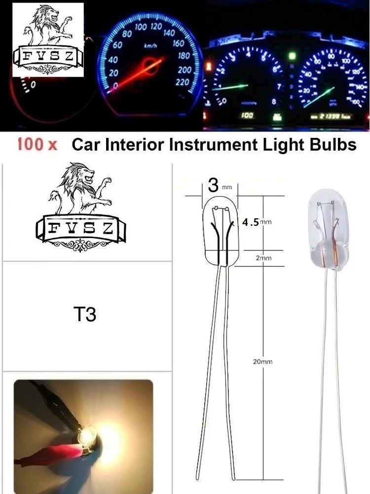 - FYSZ - Light color: Yellow - Car audio system indicator light bulbs - Low electricity consumption and long lasting - Power: DC 14V/0.56W - Comes with T3 100PCS Bulb Dimensions: 1.26 in x 0.12 in x 0.12 in (3.2 cm x 0.3 cm x 0.3 cm) Weight: 0.18 oz (1g)