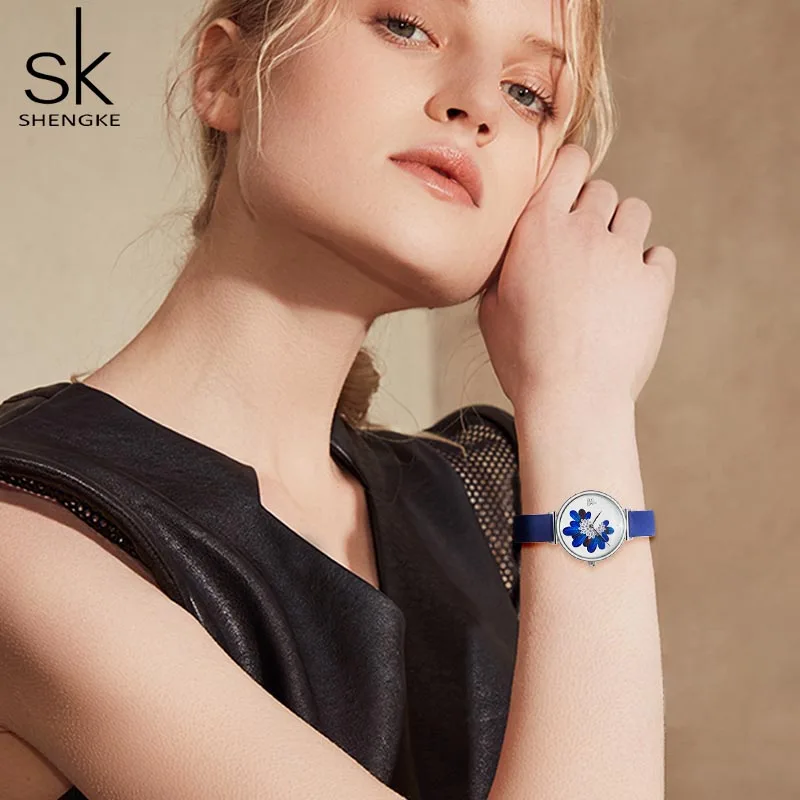 Женские часы Shengke, Роскошные наручные часы с кожаным ремешком, с синим пером, Стильные кварцевые женские часы