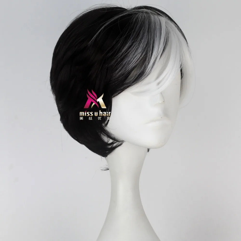 Девиль Круэлла де вил косплей парик сто один далматинец дьявол парики половина белый половина черный слоистых косплей парик