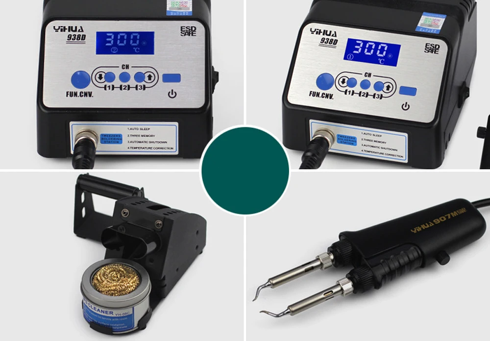 Особенности 1. Функция ЖК-дисплея с большим экраном показывает очень четко. 2. Принимаем микрокомпьютерное управление SAMSUNG, быстро разогревается. 3. Высокое качество сопротивления хорошо для длительного срока службы. 4. Этот продукт защищен от ОУР. 5. Ручка паяльника с использованием силиконового материала. 6. Передняя панель из сплава с элегантным внешним видом. 7. Чехол маленький, занимает меньше места на рабочем столе. 8. Больше паяльник ручка линии, он имеет 1,5 метр. 9. Пинцет, паяльник, параллельная обработка IC, делает его более легким для пайки и распайки. 10. Уникальная модель ручки и держатель паяльника гуманный дизайн. 11. Параллельные Электрические пинцеты, очень удобные небольшие электронные компоненты, чип, удаление чипов и установка сварных компонентов. Когда вам нужно удалить параллельный Электрический пинцет, можно использовать непосредственно на сварочных точках по компонентам резистора для нагрева. Основные функции 1. Три секции памяти: CH1/CH2/CH3, каждый сегмент хранения может хранить три температуры. 2. Функция сна, функция автоматического отключения, функция Цельсия/Фаренгейта А), функция сна паяльника автоматическое определение их состояния работы не используется в состоянии покоя, прибывает, чтобы установить время сна, температура утюга автоматически понижает температуру до 200 ° C входит в режим сна, Может эффективно предотвратить окисление железной головки и продлить срок службы железного наконечника, энергосбережение и защиту окружающей среды. Время сна может быть установлено в диапазоне от 0 до 99 минут за 1 минуту, пользователи могут быть установлены на основе использования, если вам не нужен паяльник для сна, время сна устанавливается до 0. B) функция автоматического отключения после того, как паяльник войдет в режим сна, запустите программу таймера, установите время отключения, не просыпаясь от сна, автоматического отключения, энергосбережения и защиты окружающей среды. Автоматическое Выключение времени диапазон от 0 до 99 минут в 1 минуту шагов. C) функция отображения температуры по Цельсию/Фаренгейту предназначена для удовлетворения потребностей рынка различных регионов режима отображения температуры. 3. Функция коррекции температуры: Адаптирован под воздействие окружающей среды или сменный нагреватель, железные верхние части Вызванные температурой железа и отклонением температуры дисплея могут быть скорректированы этой функцией, диапазон калибровки температуры: -50 ℃ ~ + 50 ℃