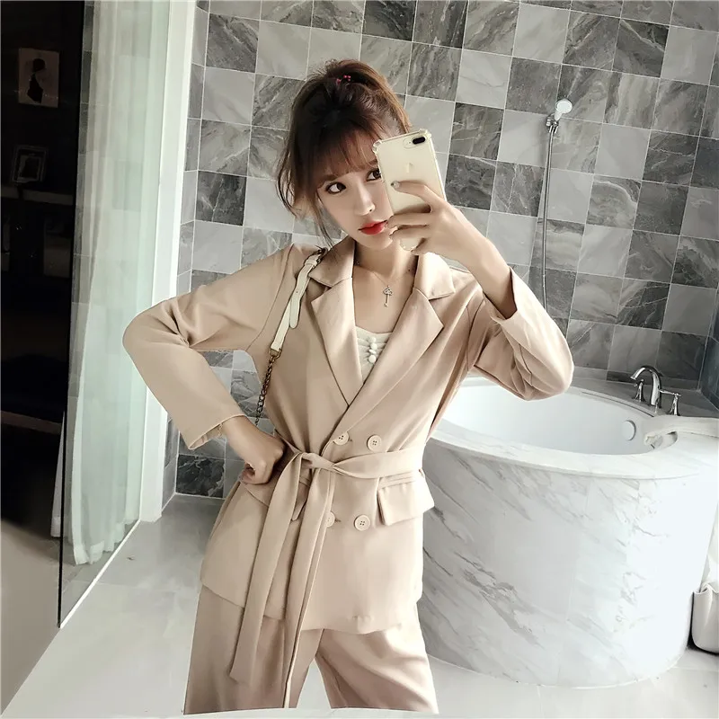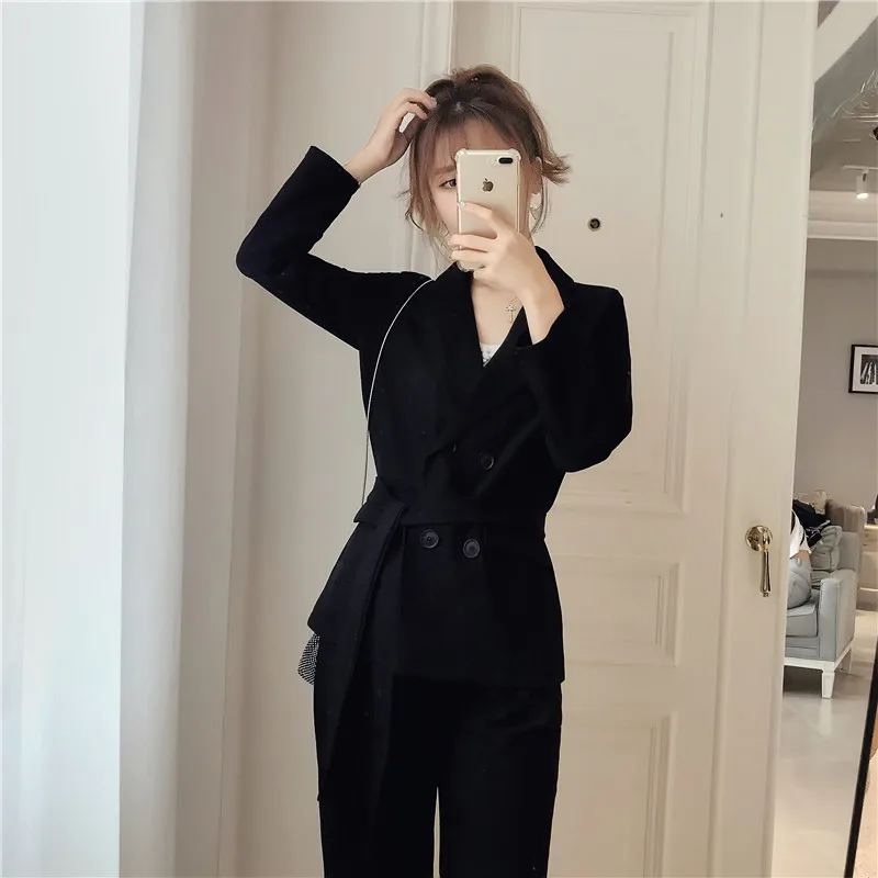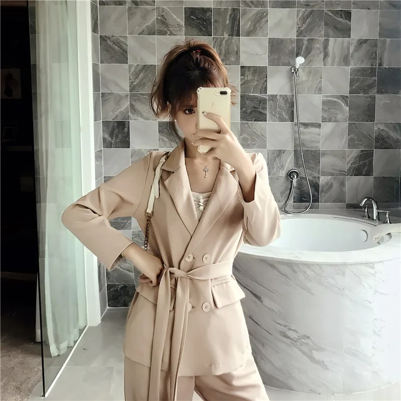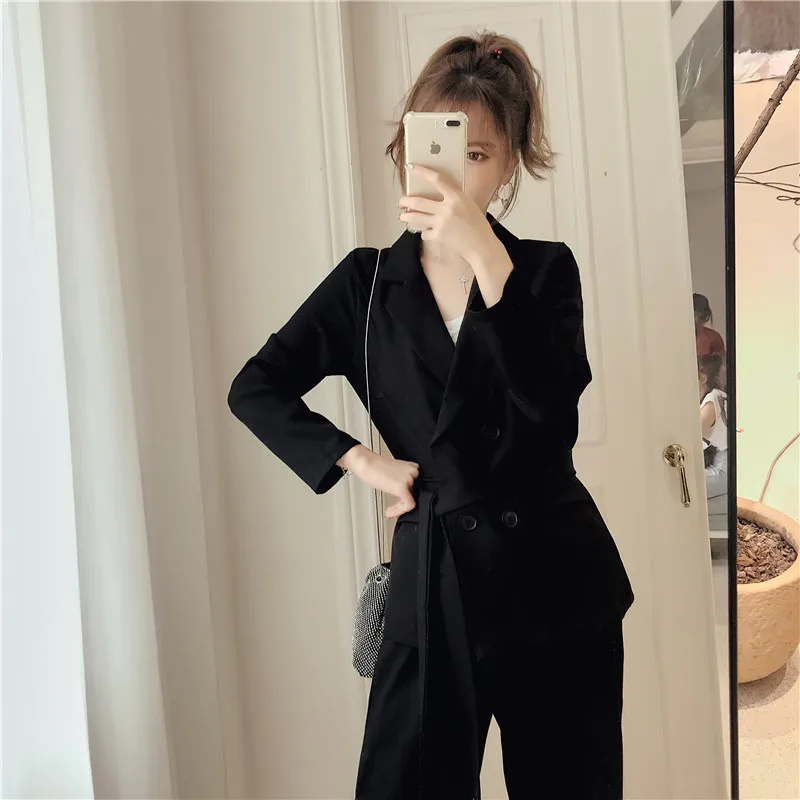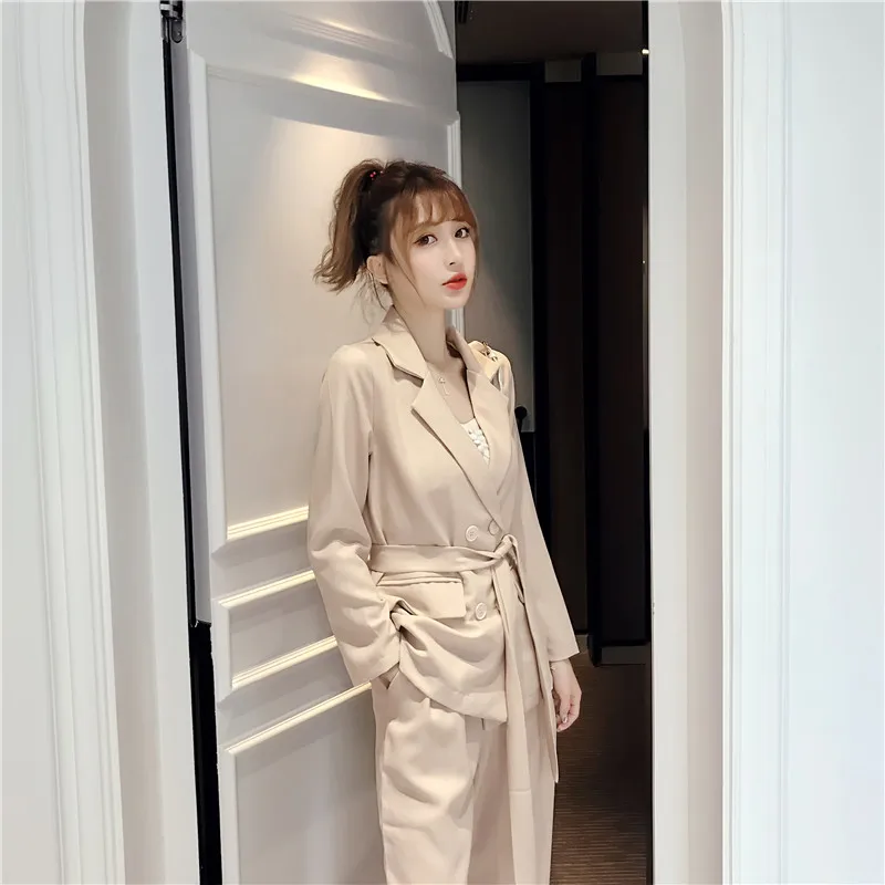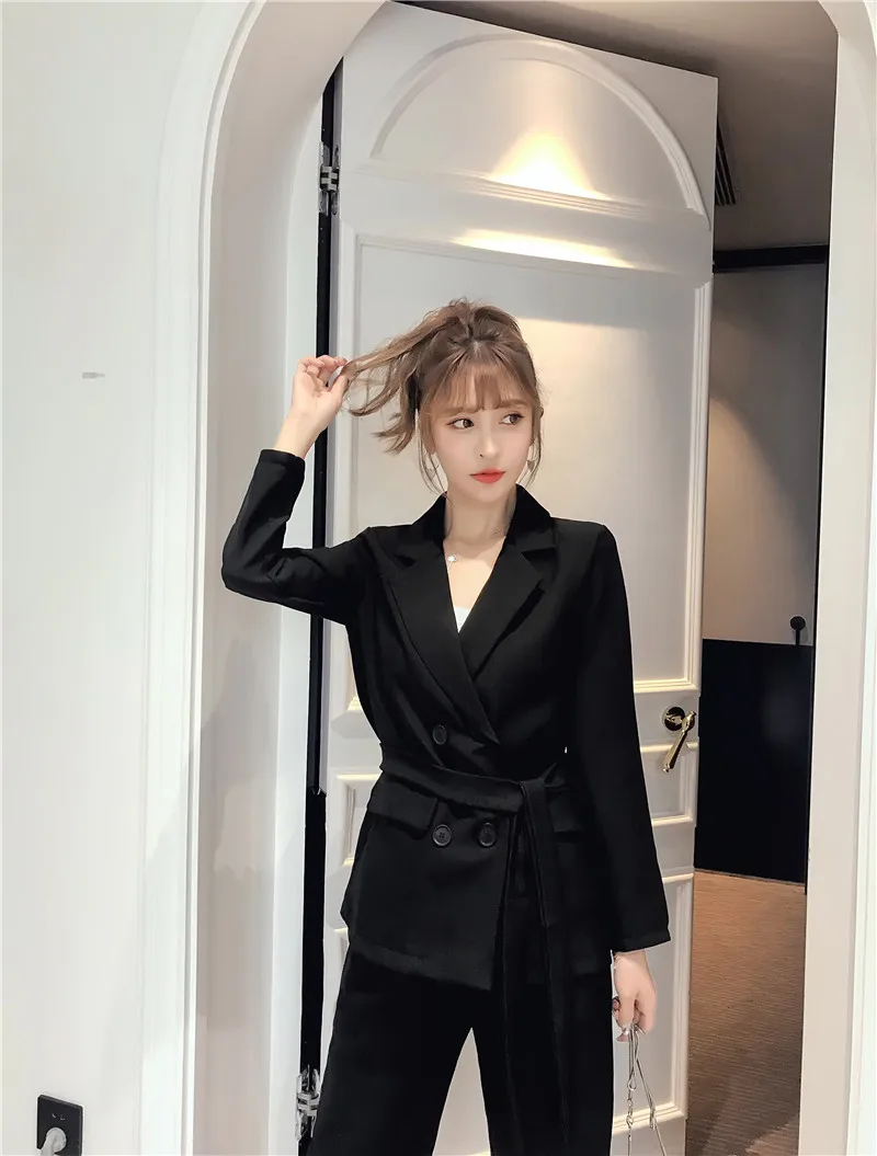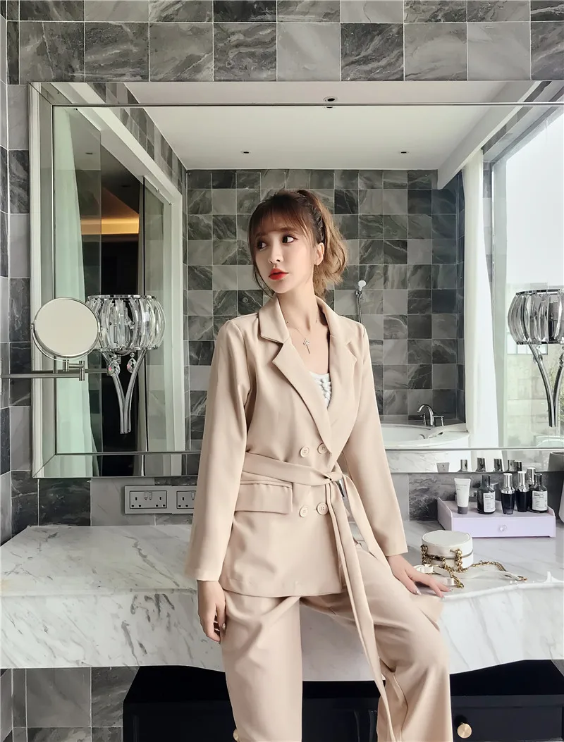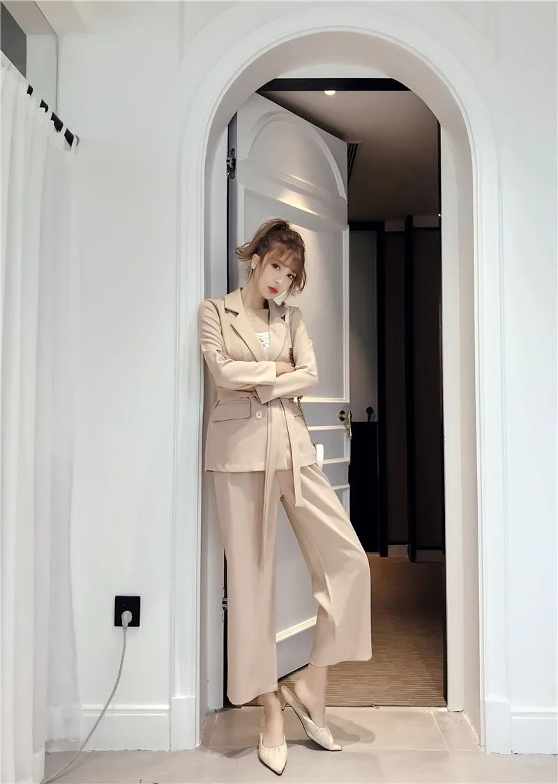 Осенне-зимний женский костюм со штанами, на шнуровке, Блейзер, куртка, широкие брюки, офисные женские комплекты