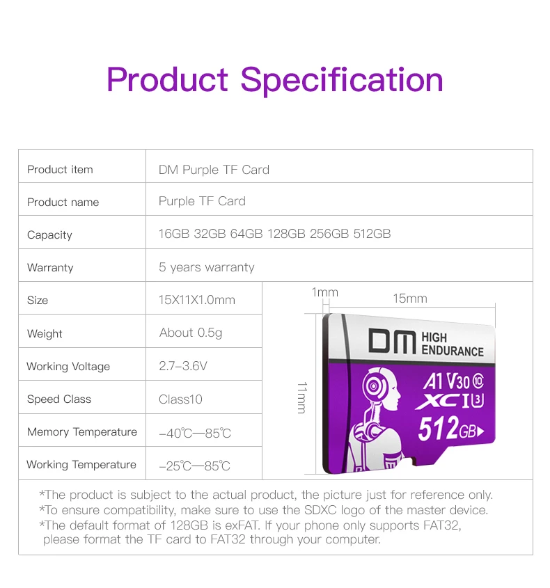 TF-карта: высокоскоростная класс 10, доступно от 8 Гб до 128 Гб; Совместимость с телефонами/планшетами/камерами и т. д.