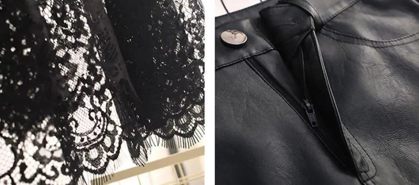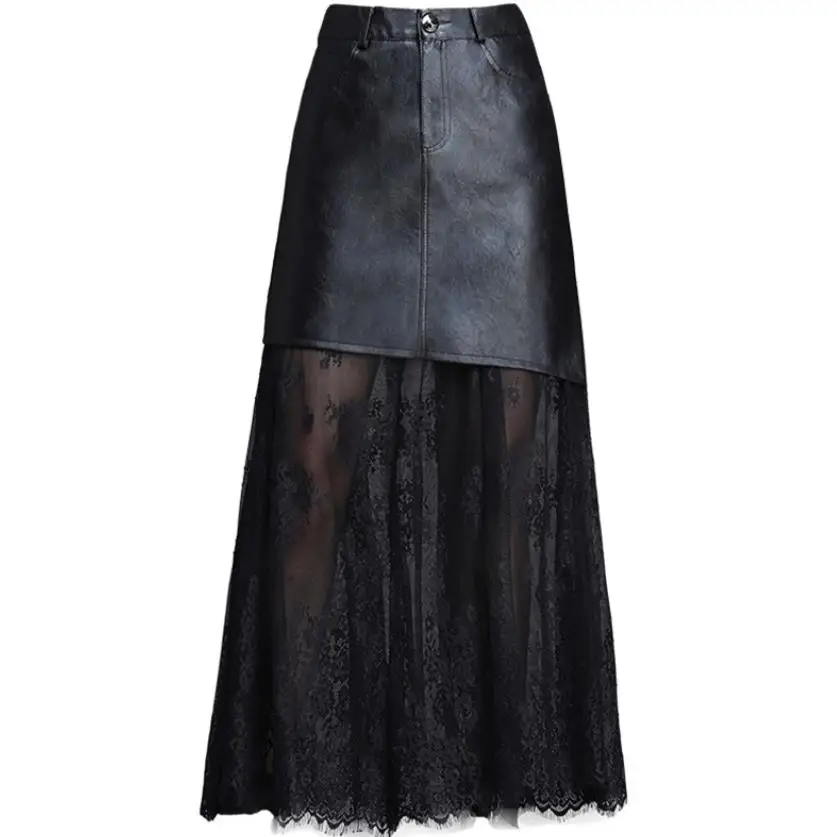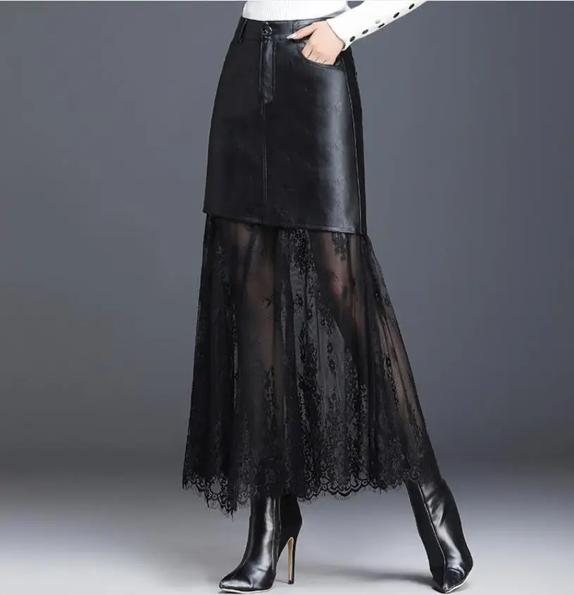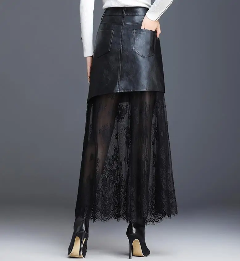 Женская длинная юбка из искусственной кожи с кружевом и высокой талией