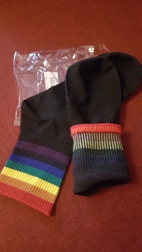 очень крутые и яркие носки, но в цветовых полосках откуда-то взялся черный. обидно, конечно, но не так страшно