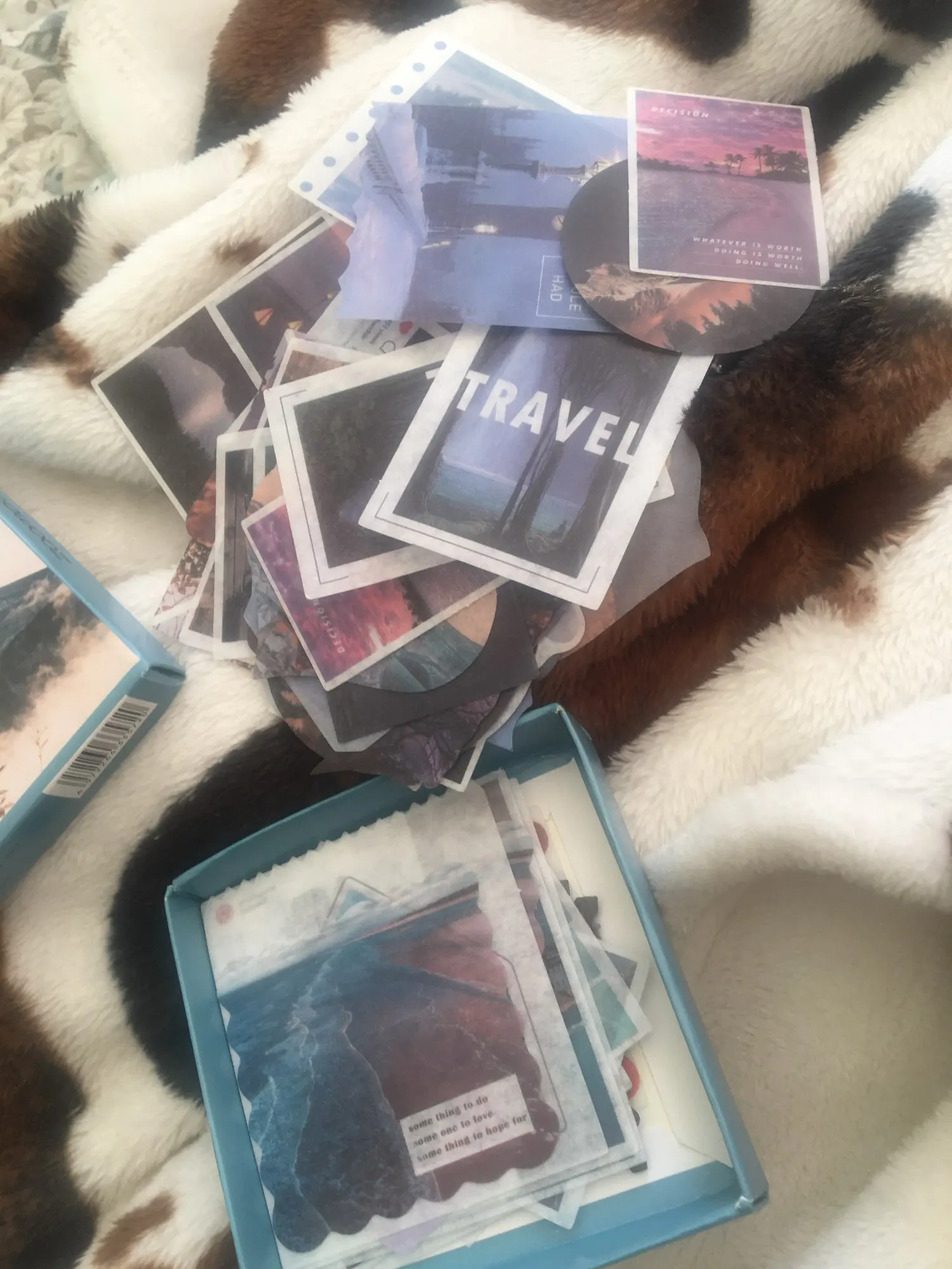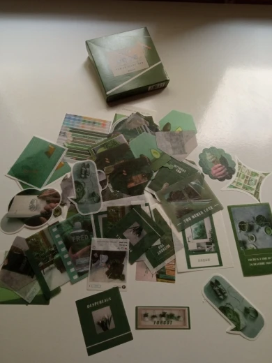 Очень атмосферный набор стикеров. Каждый стикер по-своему интересен и привлекателен. Они сами бумажные и по верх рисунка немного просвечивают, лучше клеить на белую бумагу. Очень доволен! Люблю такую атмосферу