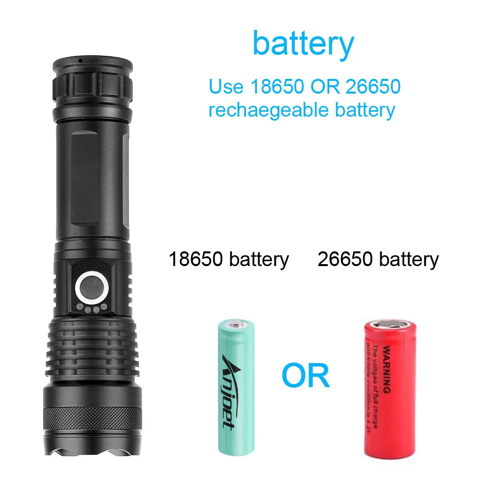 Особенности:-Мощный светодиодный фонарик с использованием лампы XHP50 светодиодный-На 1*18650 или 1*26650 батарейный отсек, чтобы продлить время работы.-Дисплей емкости аккумулятора.-Телескопический зум-Микро-usb для компьютера usb, Автомобильный USB, usb-разъем для зарядки, зарядный фонарик-Изготовлен из авиационного алюминиевого сплава прочный HAIII военный класс Жесткий-анодированный-IPX-6 водонепроницаемый, водостойкий, может использоваться в дождливую погоду, но не может положить его в воду-Подходит для работы, охоты, альпинизма, рыбалки, кемпинга и активного отдыха и т. д.-Ударопрочный до 2 метровПараметры продукта:Режим: 5 режимов освещения (XHP50)Модель светодиодный бусины: XHP50Материал корпуса: алюминиевый сплавМасштабируемый: Регулируемый фокусМатериал линз: выпуклая линзаЦвет излучения: белый светильникТип батареи: 1*18650 аккумуляторная батарея или 1*26650 аккумуляторная батарея